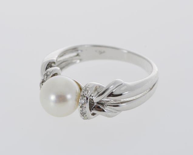 3072. Bague sertie d'une perle bordée de deux lignes de diamants