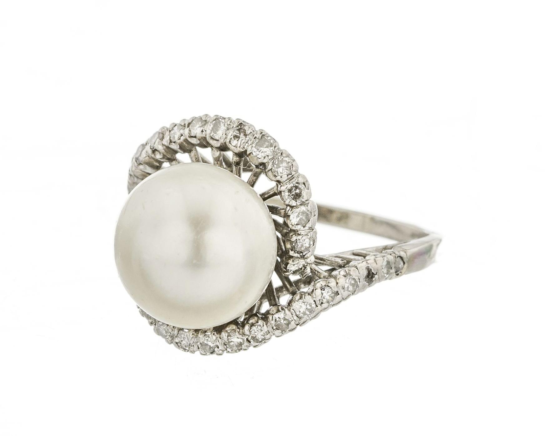 3120. Bague sertie d'une perle (D env. 11.5 mm) entourée de diamants
