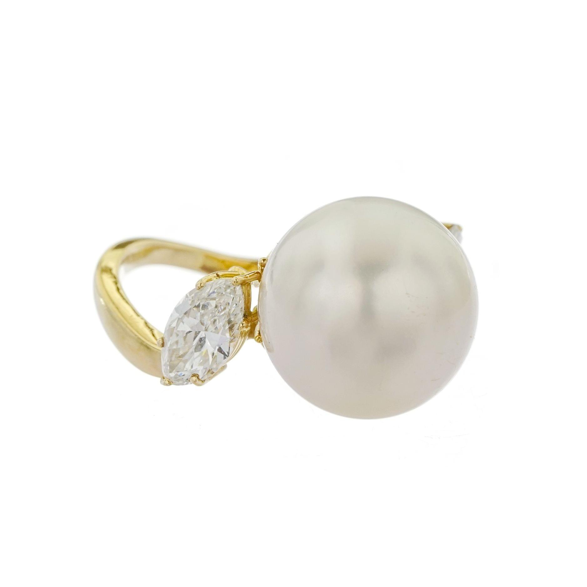 922. Bague sertie d'une perle (D env. 13 mm) épaulée de deux diamants taille marquise (env. 1 ct)