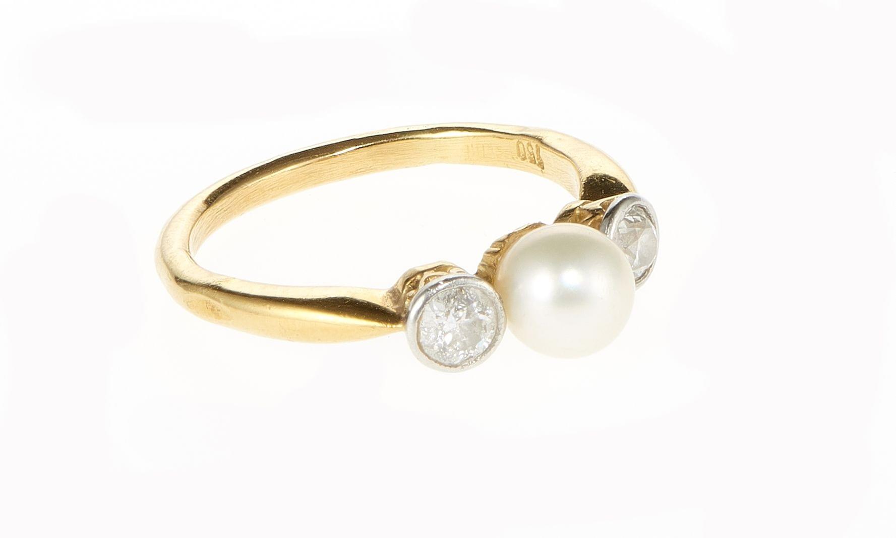 4274. Bague sertie d'une perle (D env. 5 mm) épaulée de deux diamants (env. 0,2 ct)