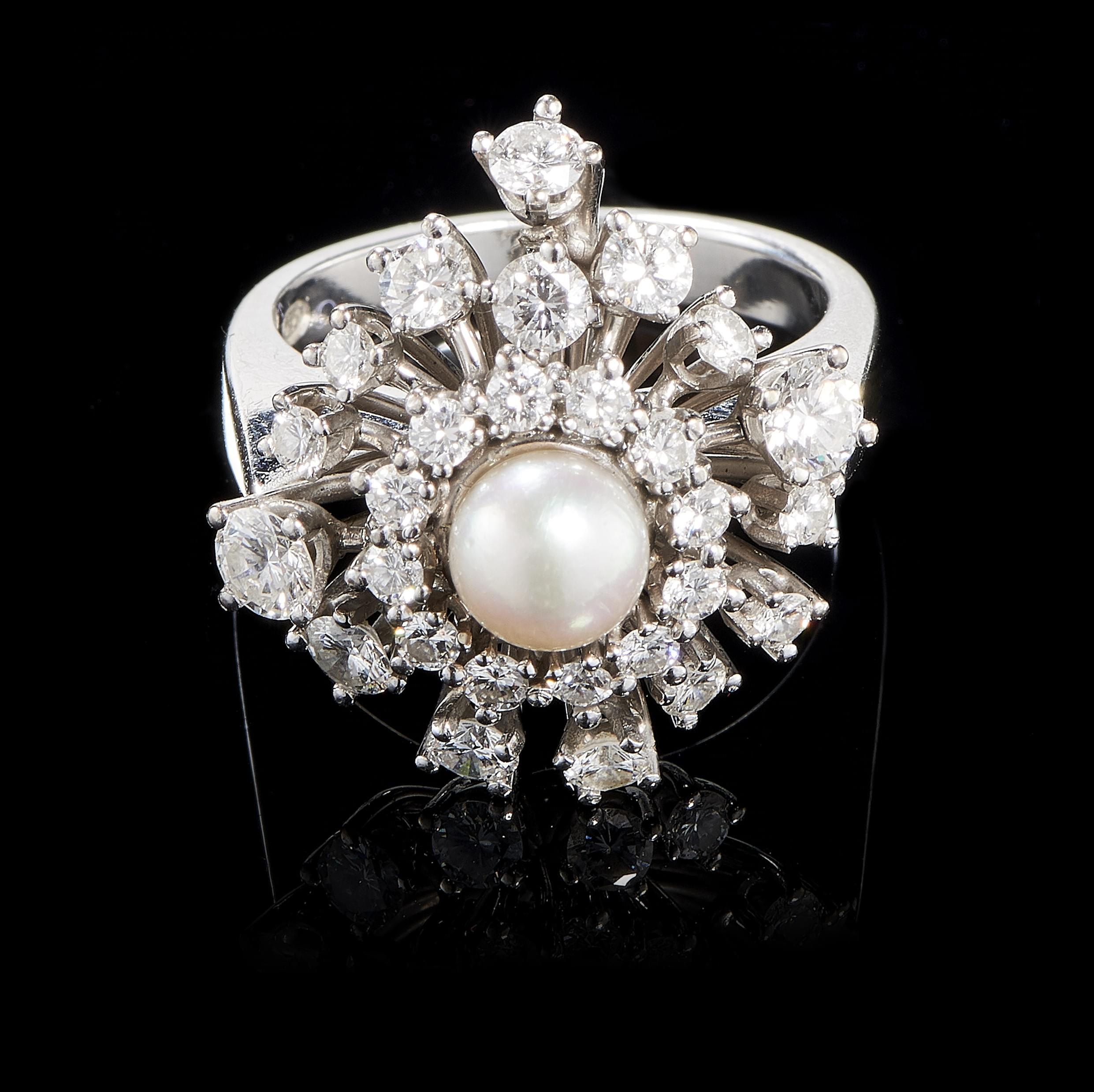 1000. Bague sertie d'une perle dans un double entourage de diamants (env. 1,5 ct)