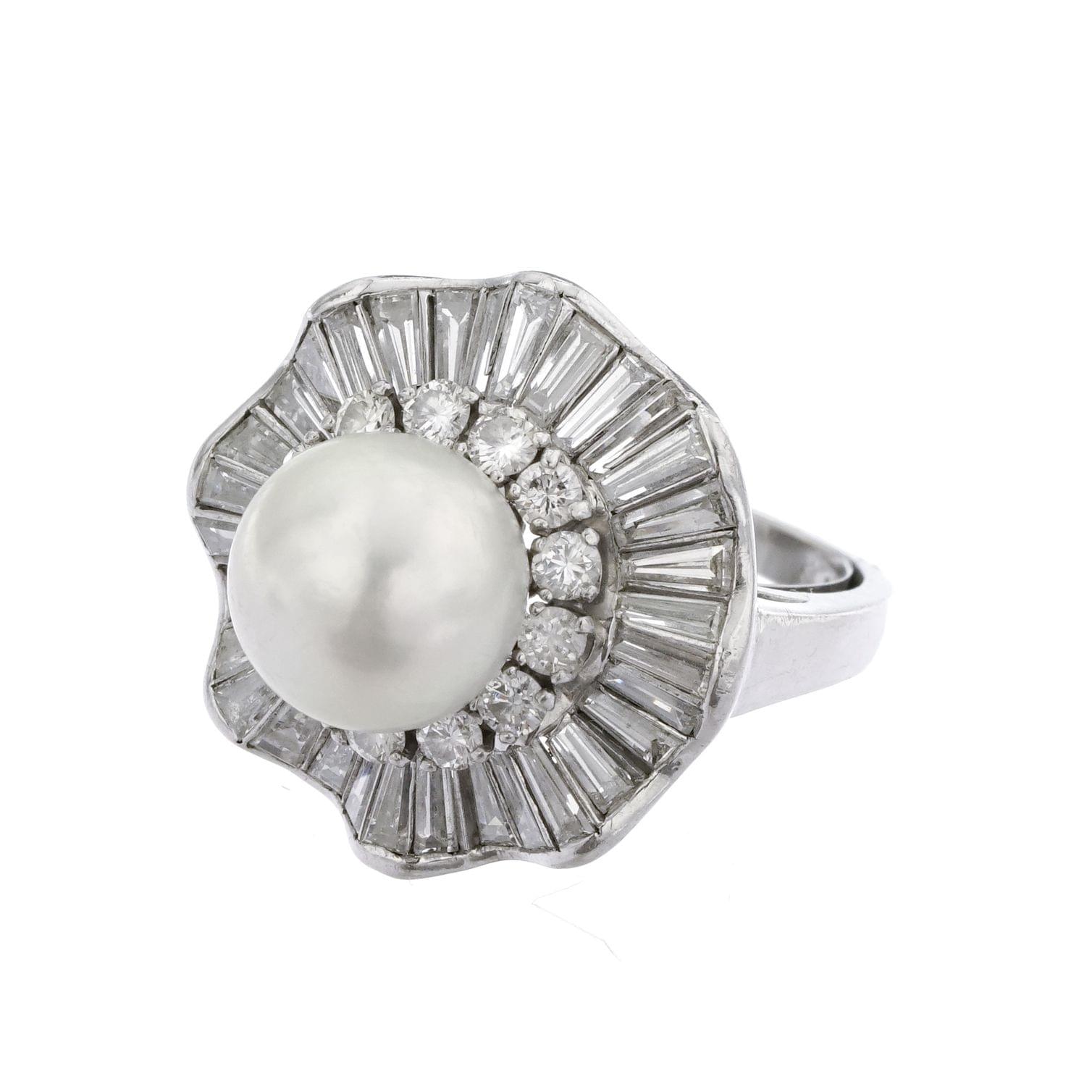 924. Bague sertie d'une perle entourée de diamants taille brillant et taille baguette (env. 1.5 ct) formant un motif de vague