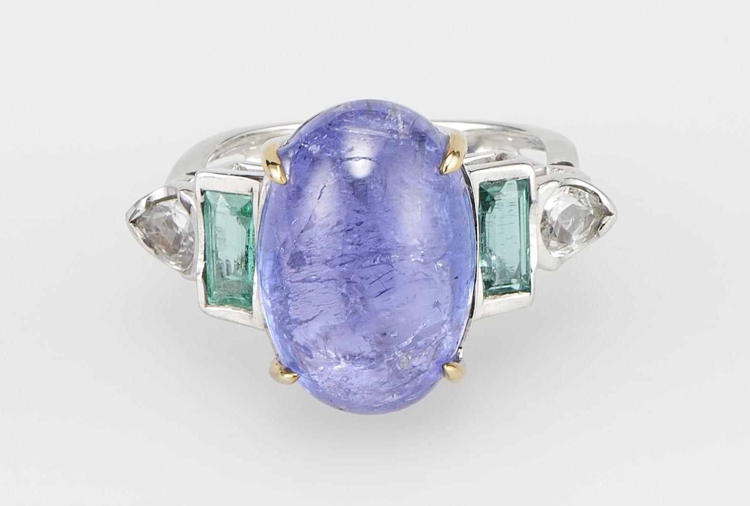 3492. *Bague sertie d'une tanzanite taille cabochon (env. 11 ct) épaulée d'émeraudes et de saphirs blancs