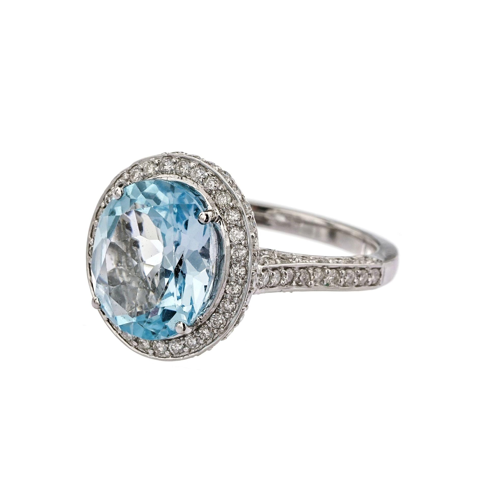 980. Bague sertie d'une topaze bleue taille ovale (env. 5 ct) entourée de diamants sur une monture semi-pavée de diamants