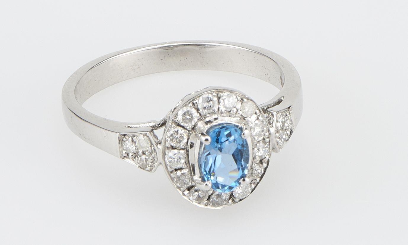 3303. *Bague sertie d'une topaze bleue taille ovale (env. 0,4 ct) entourée de diamants