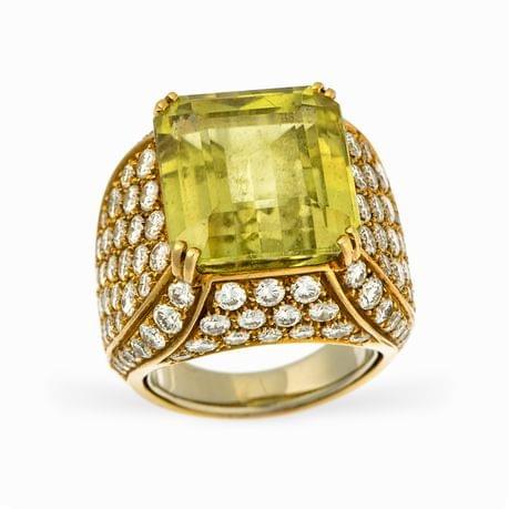 439. Bague sertie d'une tourmaline jaune taille émeraude (env 9 ct) et pavée de diamants