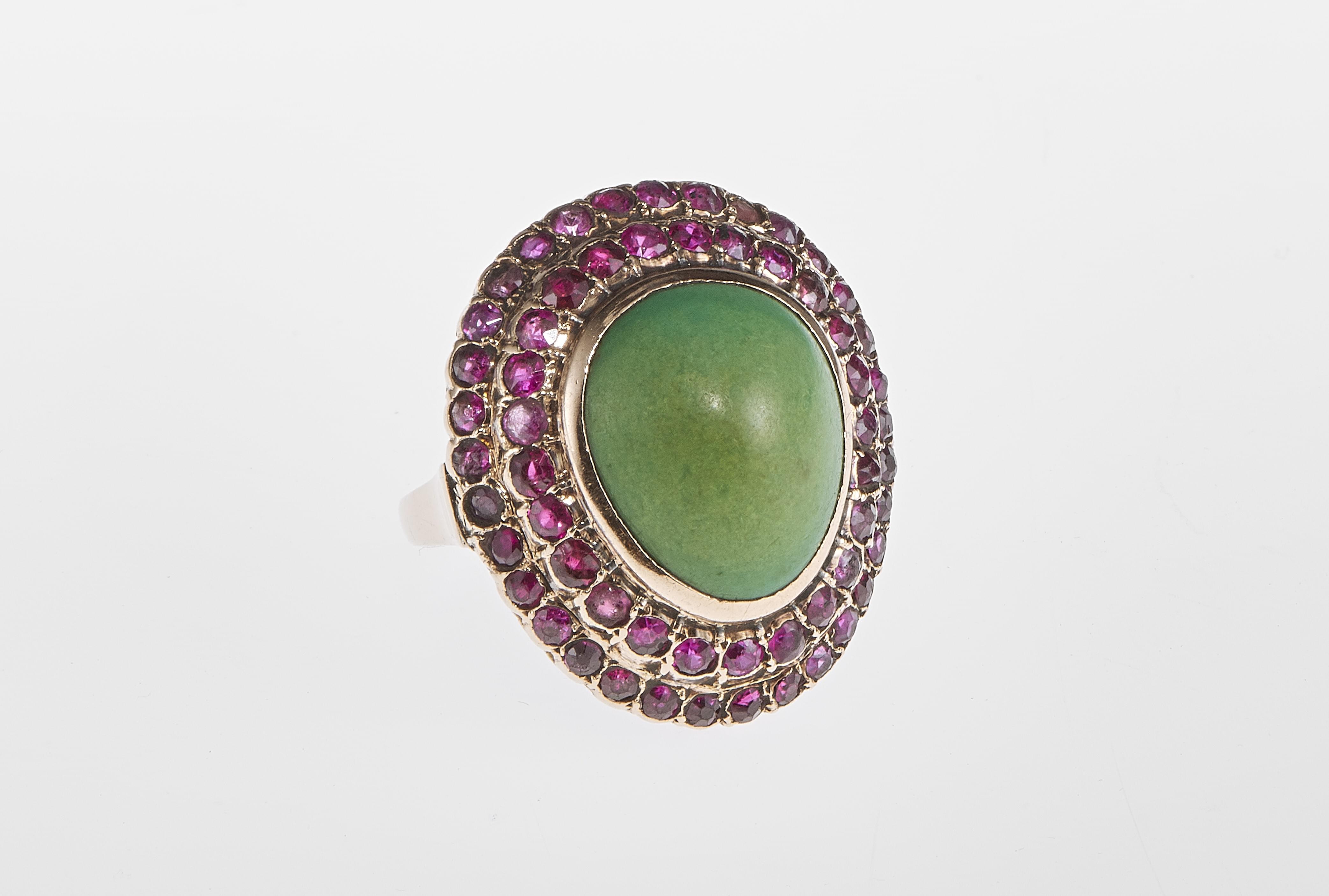 3258. Bague sertie d'une turquoise taille cabochon dans un double entourage de rubis