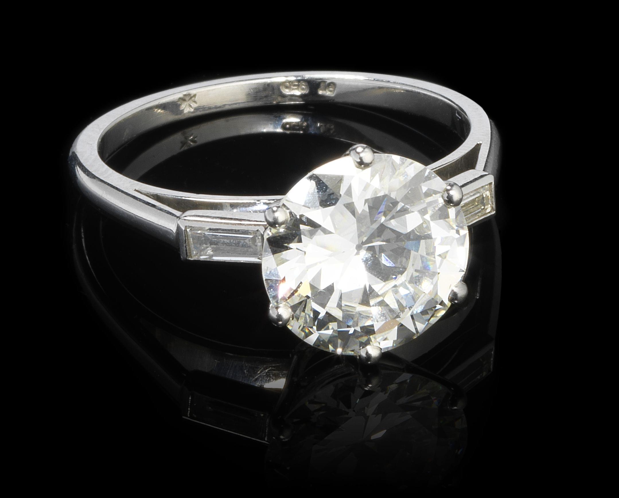 82. Bague solitaire sertie d'un diamant demi-taille (env. 2,8 ct) épaulé de deux diamants taille baguette