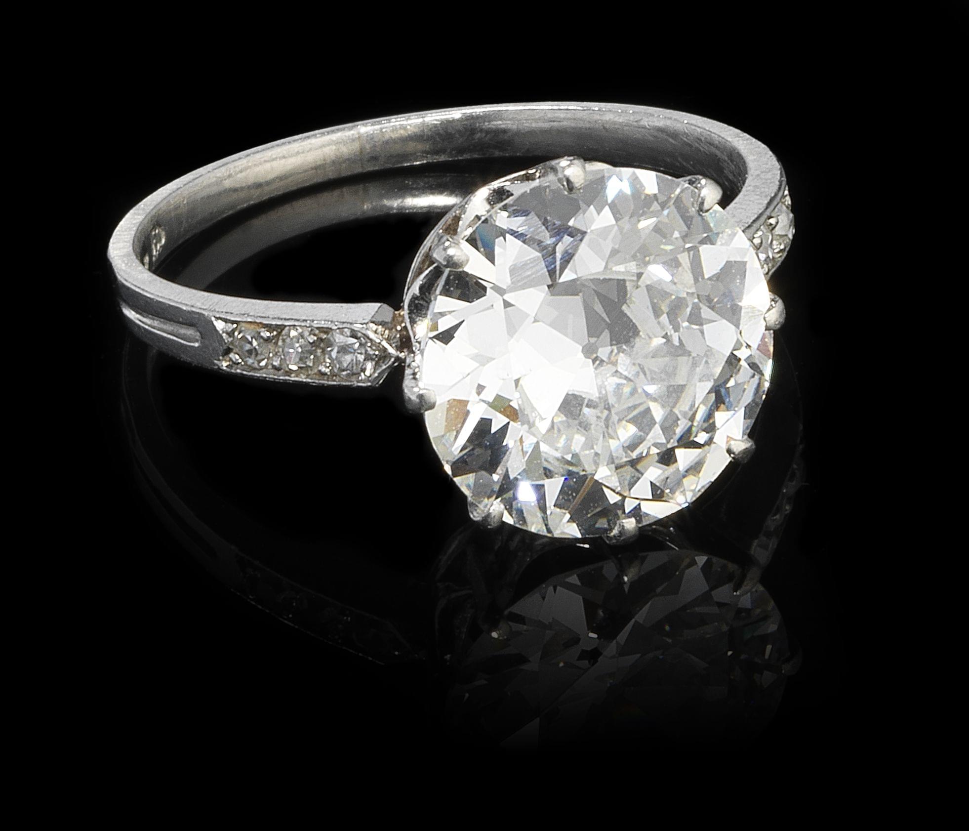 80. Bague solitaire sertie d'un diamant demi-taille (env. 2,8 ct) épaulé de petits diamants taille 8/8