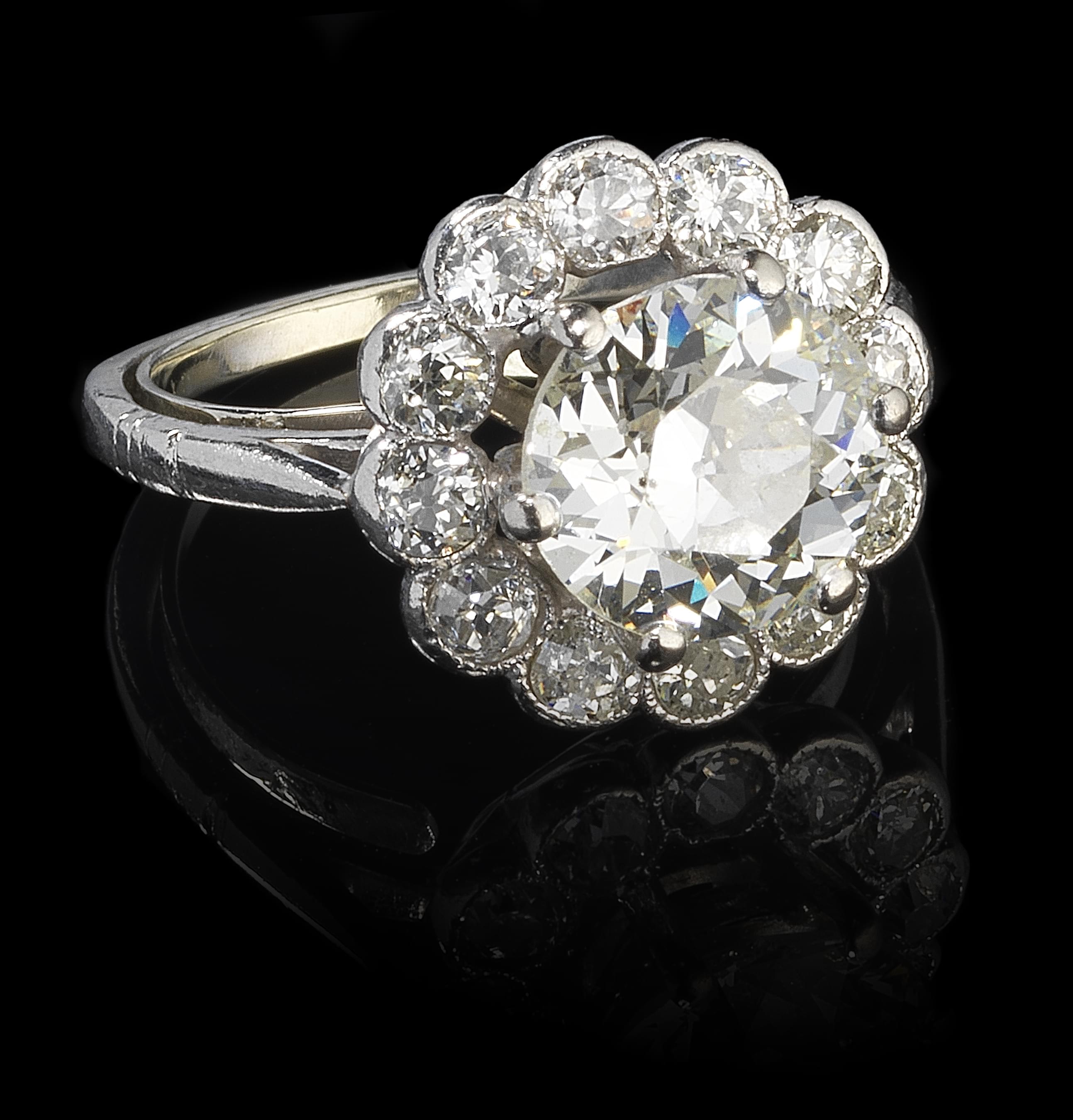 90. Bague solitaire sertie d'un diamant taille ancienne (env. 1,5 ct) entouré de diamants (env. 0,6 ct)