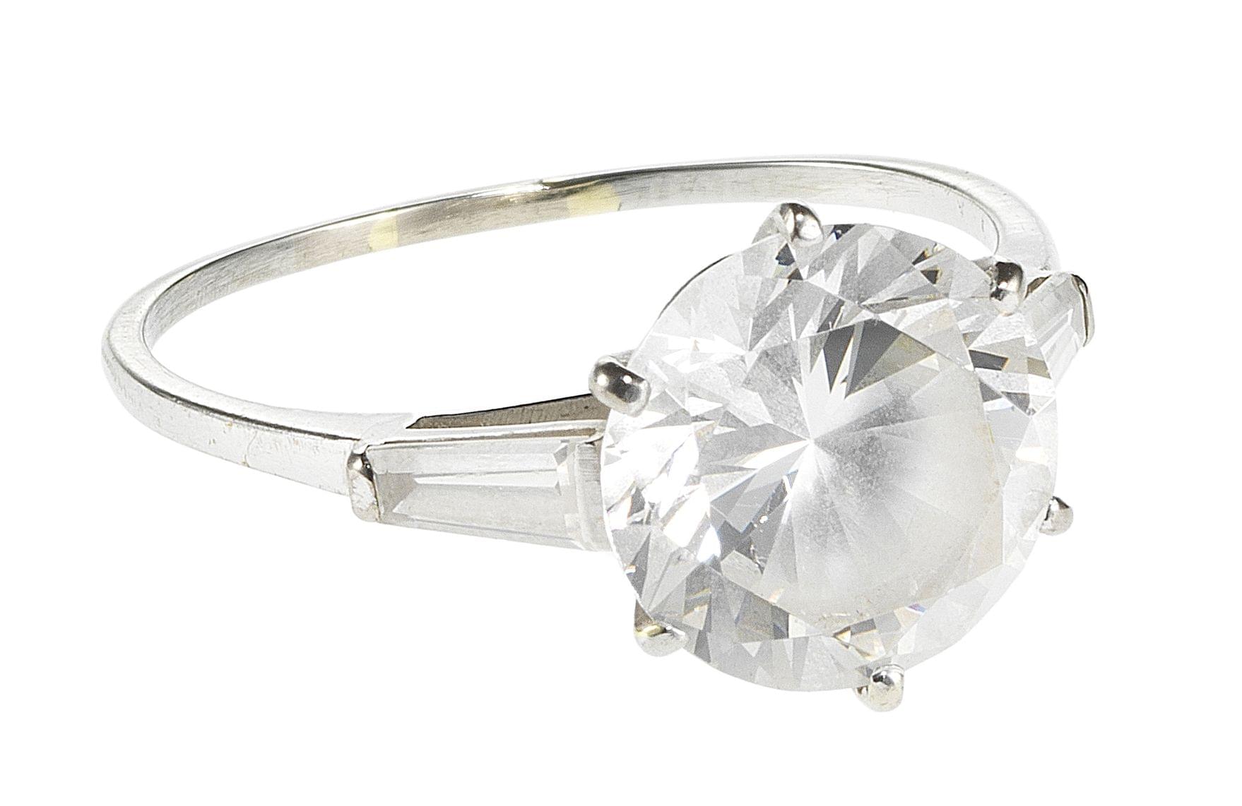 3147. Bague solitaire sertie d'une pierre d'imitation pour le diamant, épaulée de pierres d'imitation taille baguette