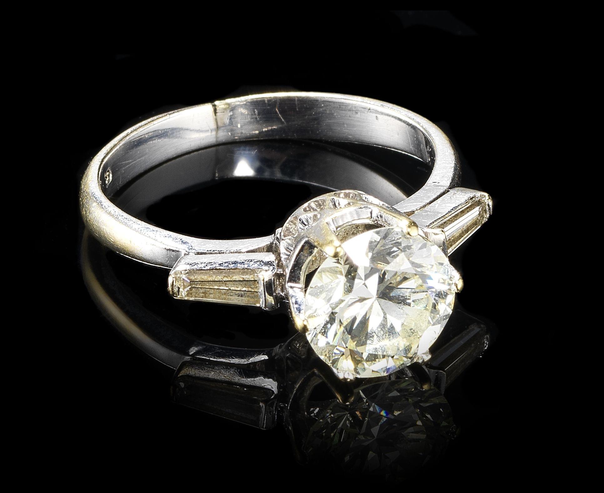 291. Bague solitaire sertie d'un diamant (env. 1,6 ct) épaulé de deux diamants taille trapèze