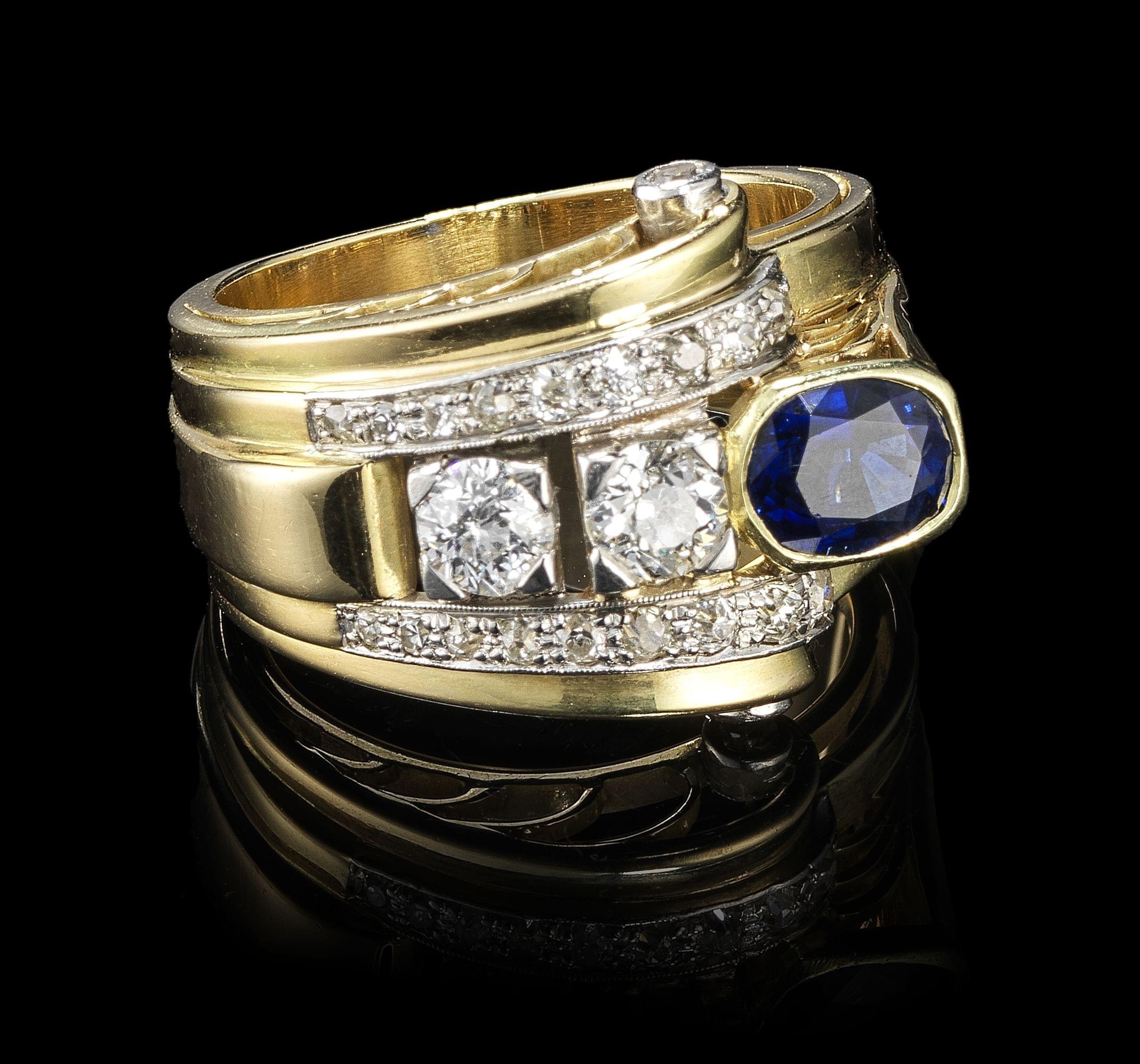 Epaulé de deux diamants taille ancienne et rehaussé de deux lignes de diamants (env. 0,5 ct), travail français, circa 1950, or et or gris 585, doigt 55-15, 11 g