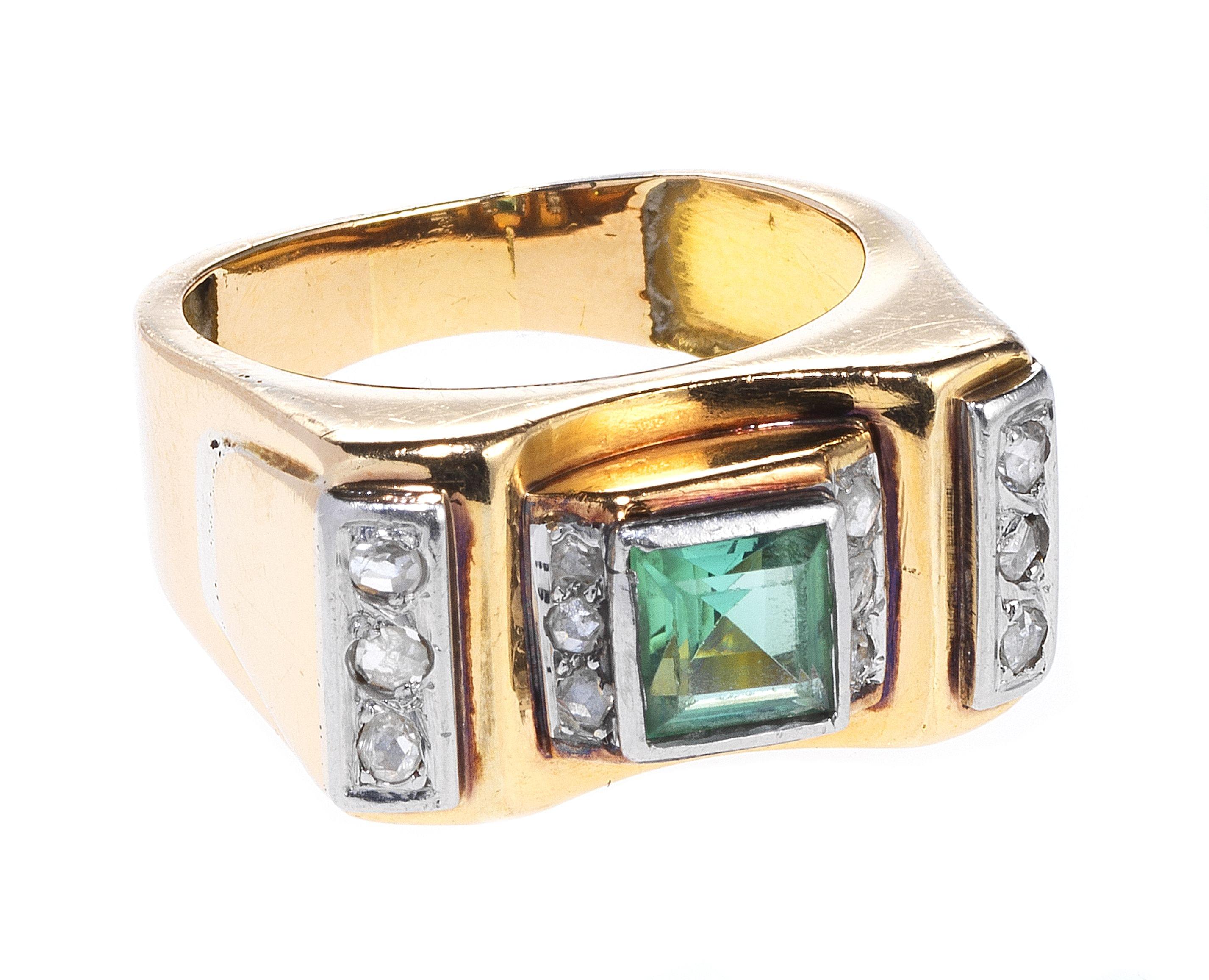 3241. Bague "Tank" sertie d'une tourmaline verte épaulée de lignes de roses de diamant