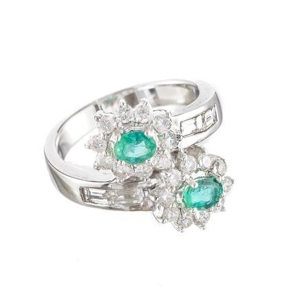 287. Bague toi et moi sertie de deux émeraudes (env. 0.5 ct) entourées de diamants et épaulées de diamants baguettes (env. 0.95 ct)