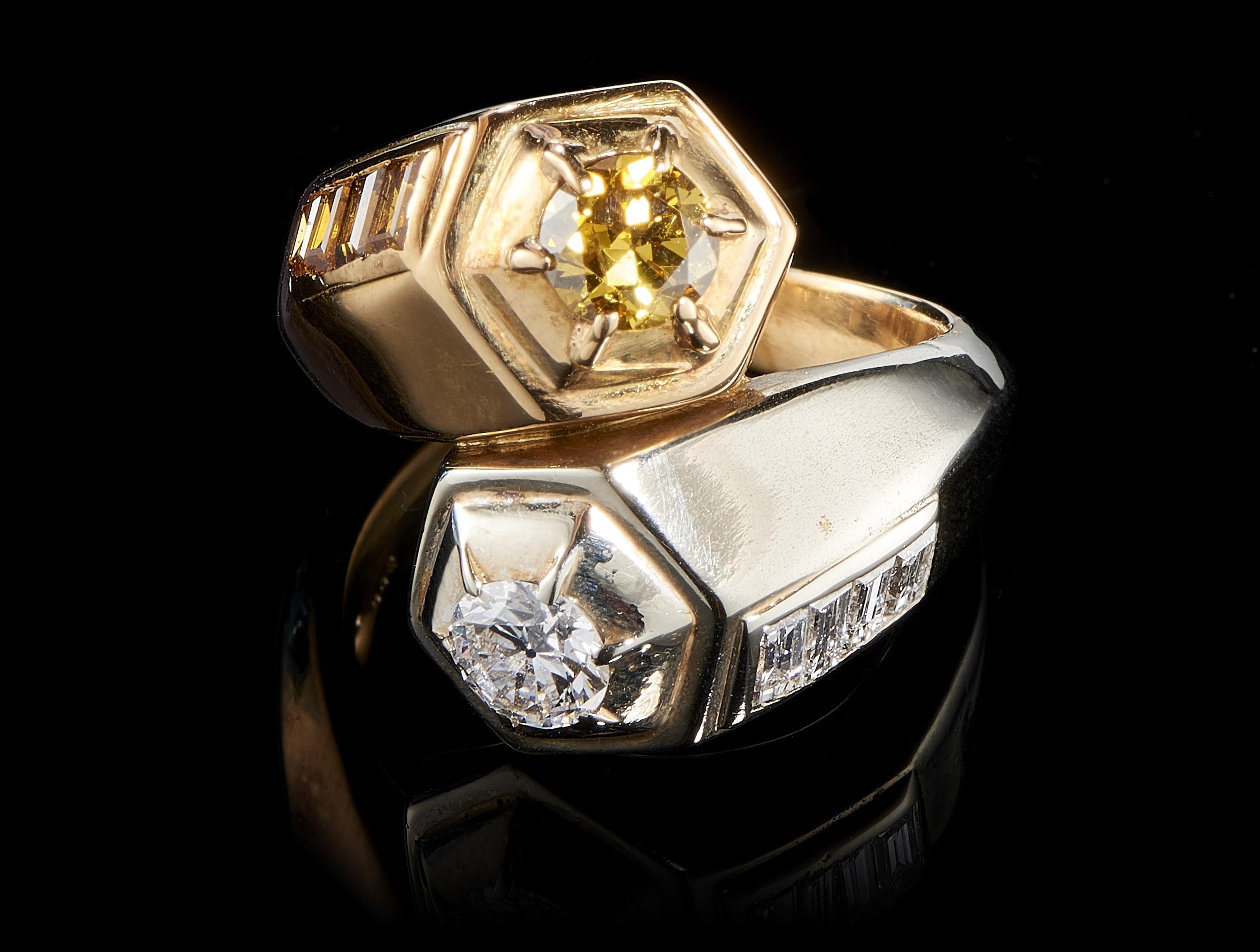 1089. Bague toi et moi sertie d'un diamant et d'un diamant jaune taille ancienne (tot. env. 1 ct) épaulés chacun d'une rangée de diamants et de diamants jaunes