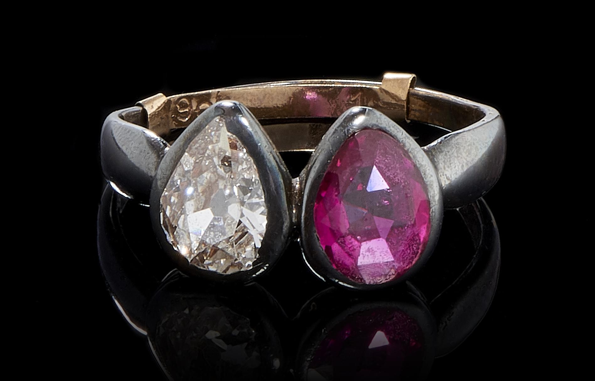 958. Bague "toi et moi" sertie d'un rubis (env. 0.6 ct) et d'un diamant (env. 0.6 ct), chacun taille poire ancienne