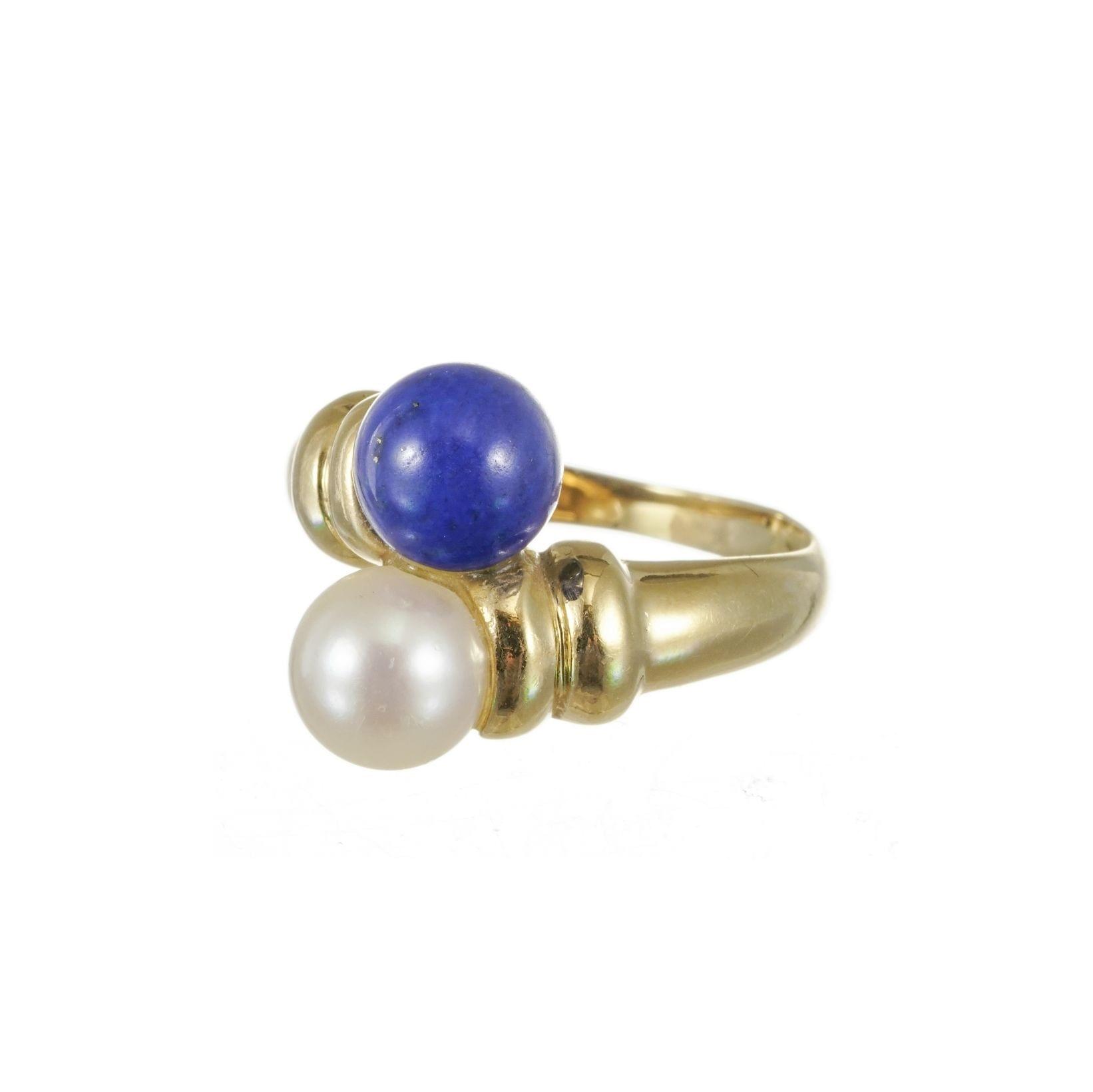 3158. Bague toi et moi sertie d'une perle et d'une boule de lapis-lazuli