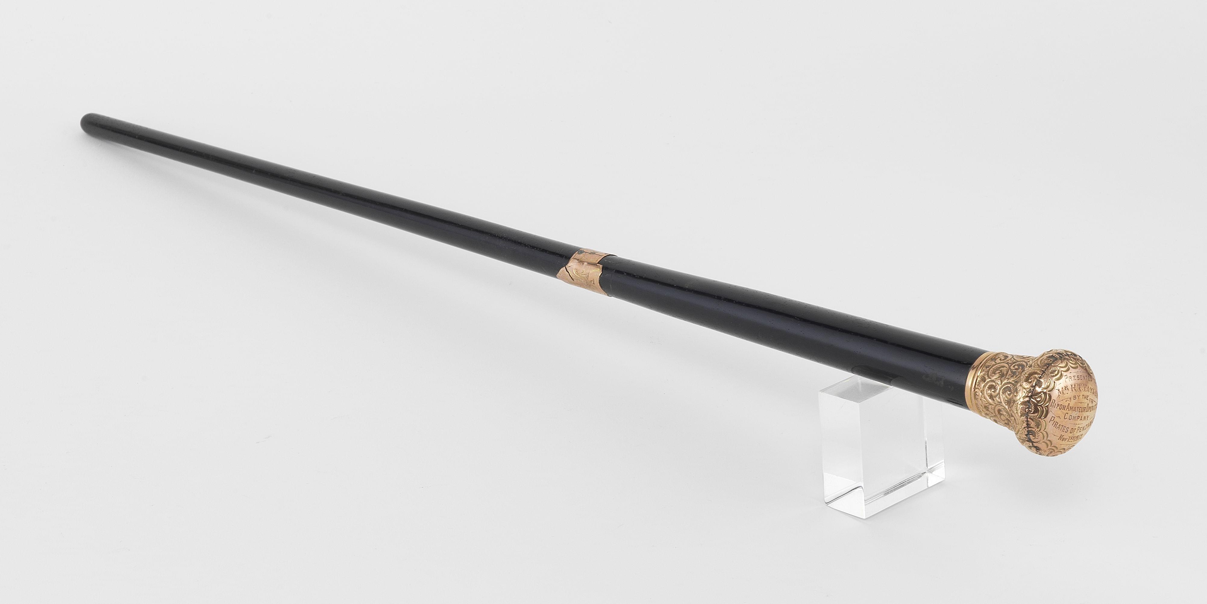 Dédicacée et datée 1904, pommeau à décor repoussé de rinceaux, bois noirci et or, L 56 cm