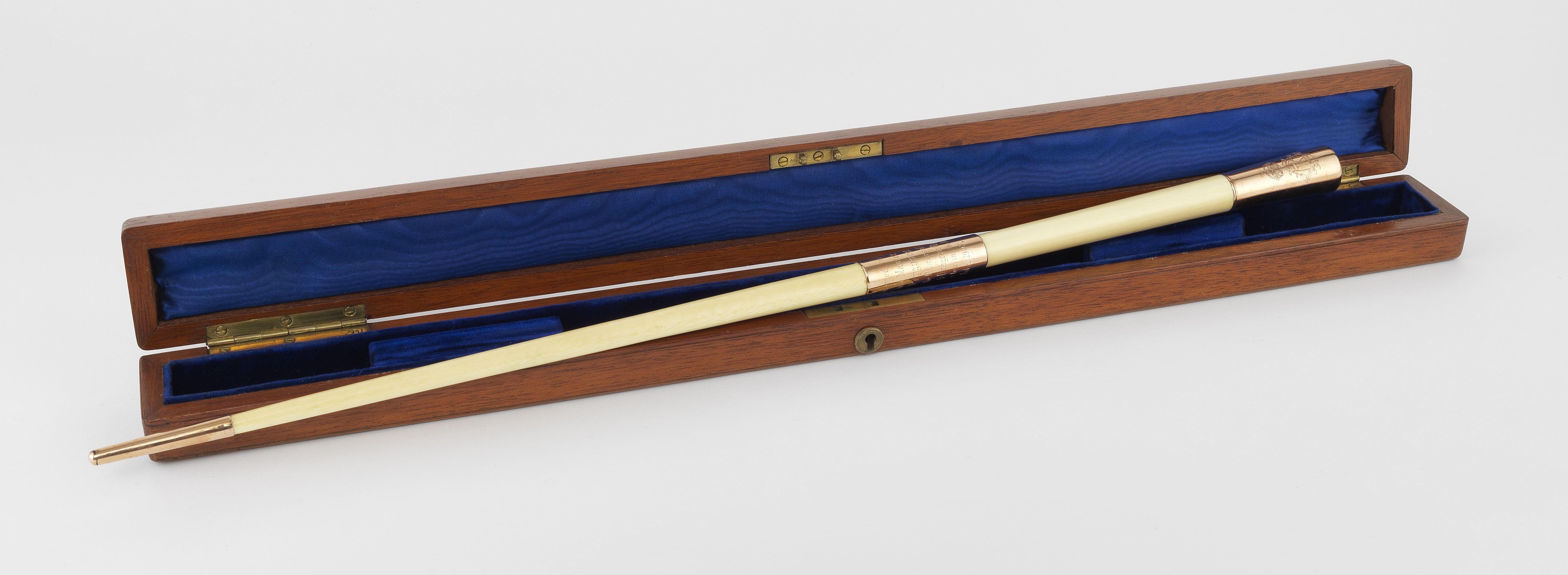 Offerte à F.Ferguson Chef de la bande des dragons de sa Majesté, datée 1907, or et ivoire, dans son écrin, L 56 cm