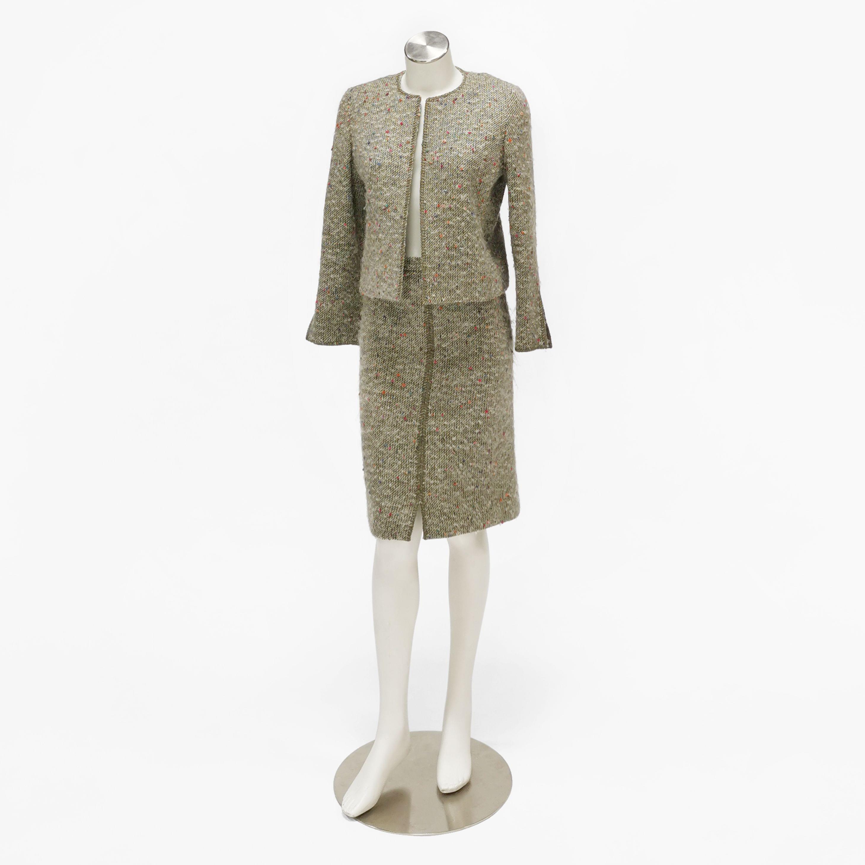 Un ensemble veste et jupe en laine kaki et pois colorés, intérieur en soie moka, taille 36; un deuxième ensemble veste et jupe en viscose, soie orange, fermeture à boutons dorés, intérieur en soie moka, taille 36; un blazer bleu marine taille 36 et un pantalon noir, laine et acétate, taille 38