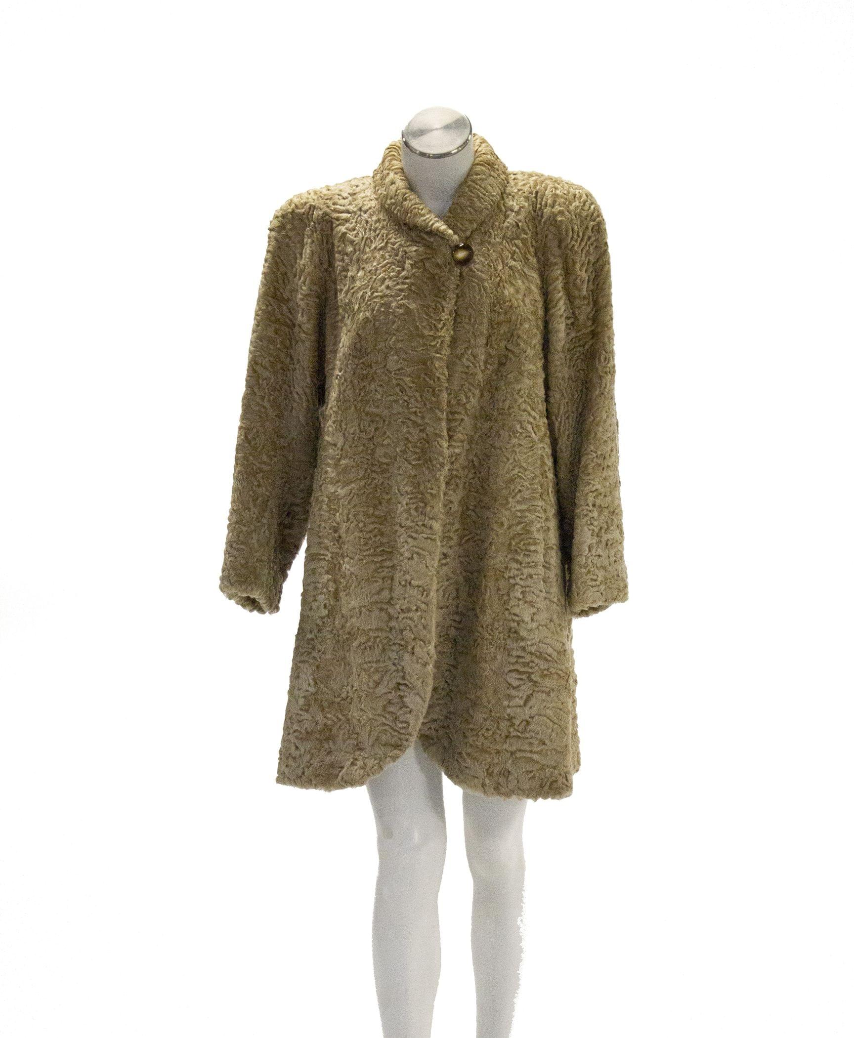 Fourrure d'astrakan beige, intérieur en soie beige, poches latérales, fermeture à clips