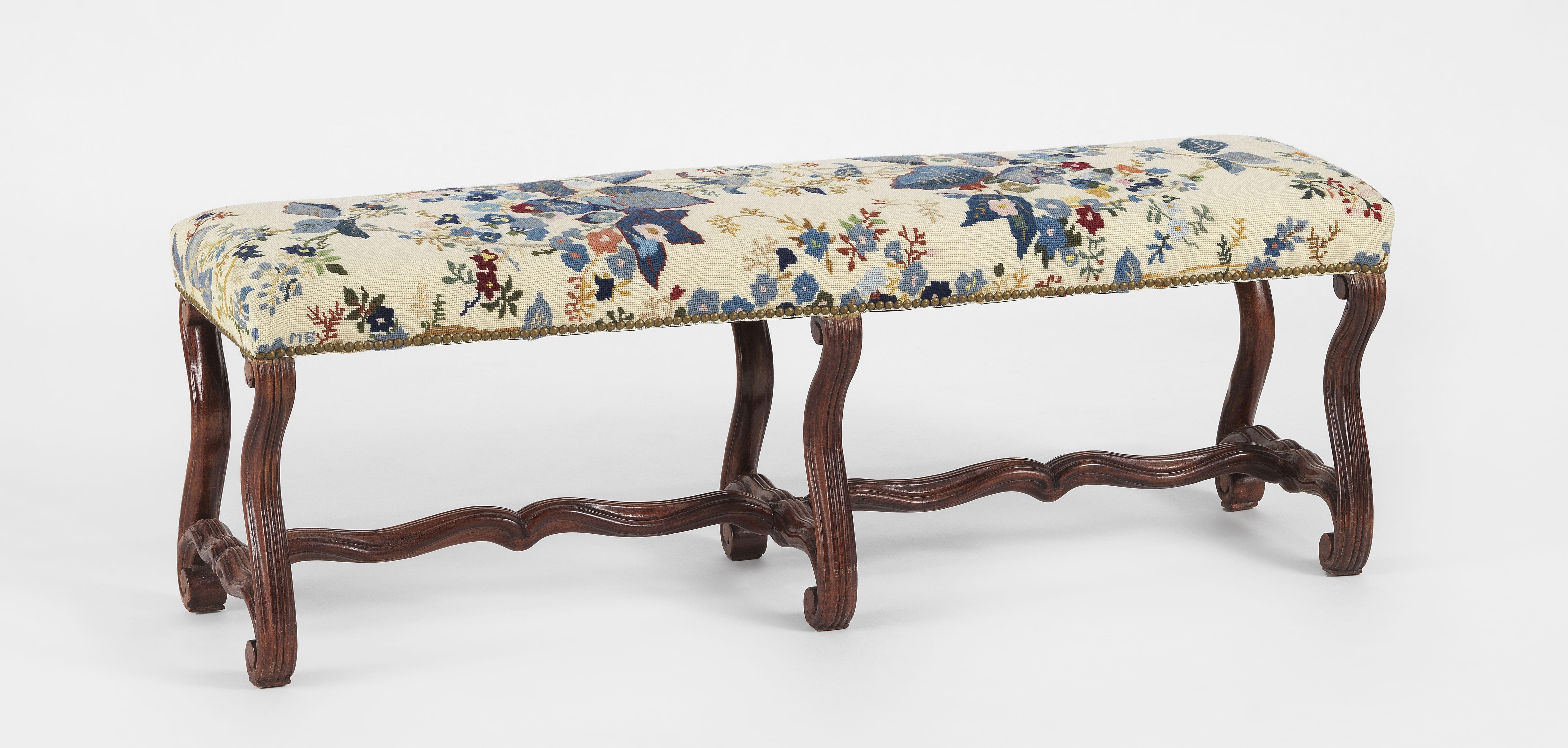 Bois au naturel, garniture au petit point sur fond crème, L 128 cm