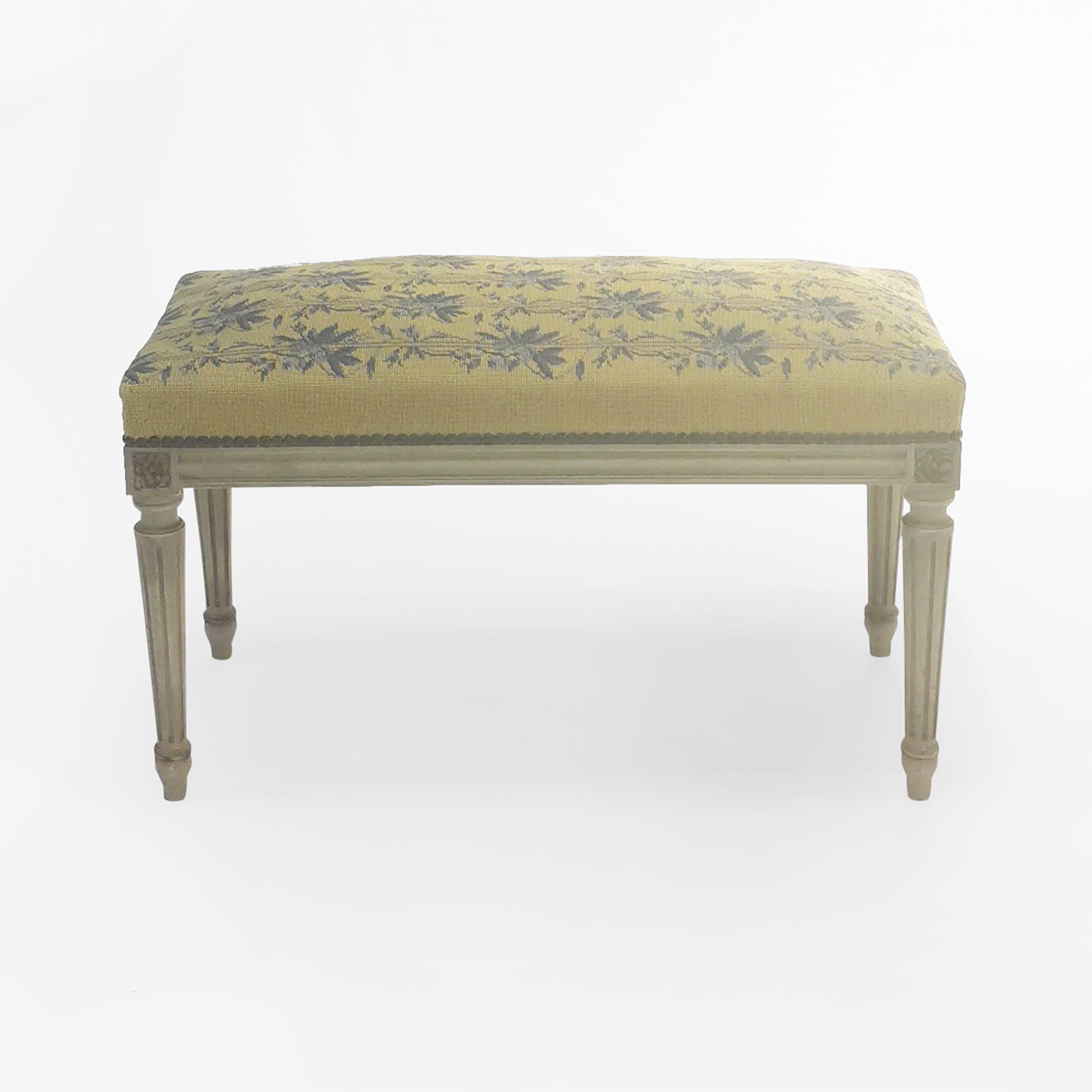 Bois laqué gris, tissu jaune, 45x76x35 cm
