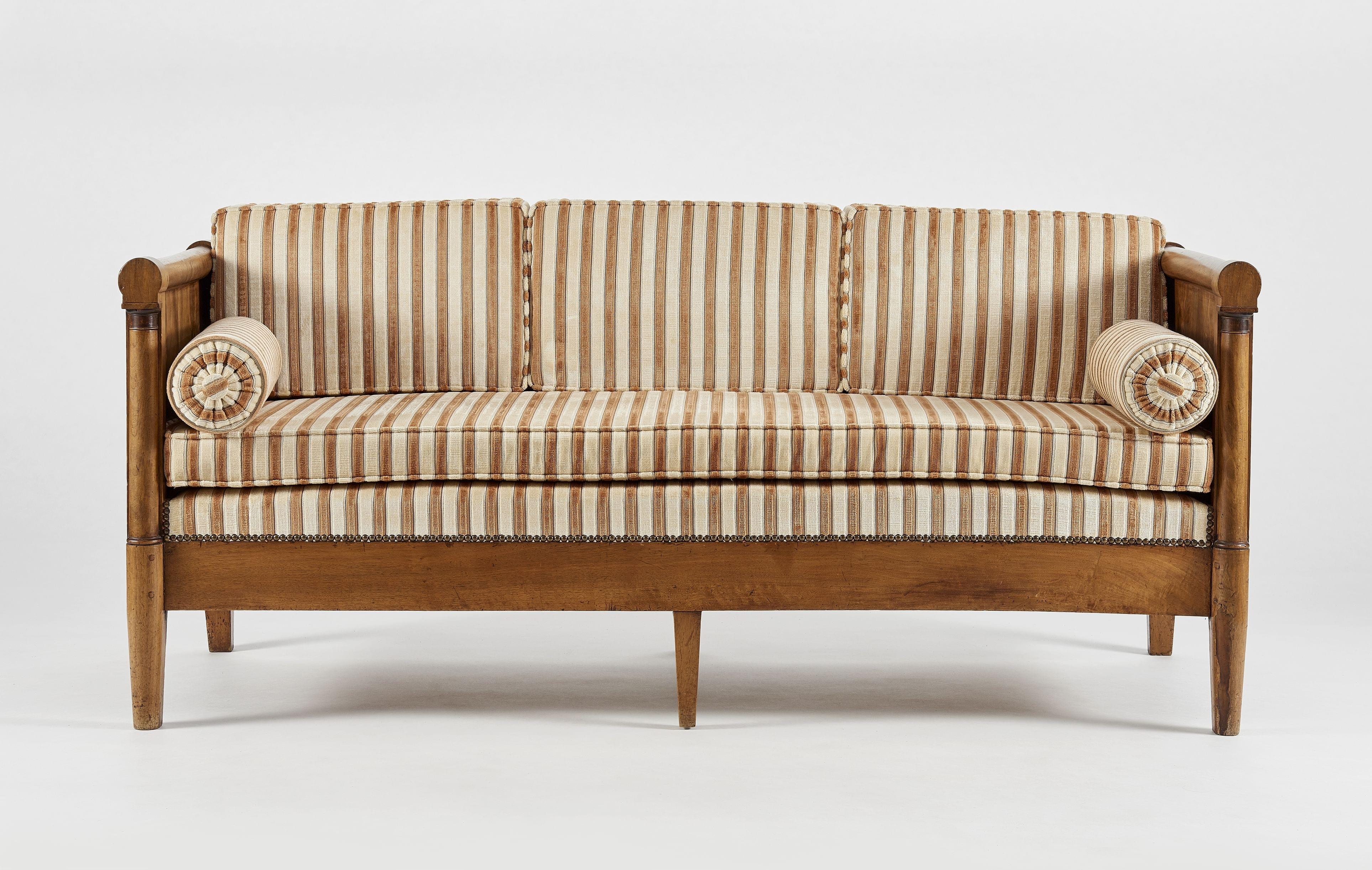 Bois fruitier et velours à rayures et coussins à carreaux. Provenance: collection Pernet-Villaverde