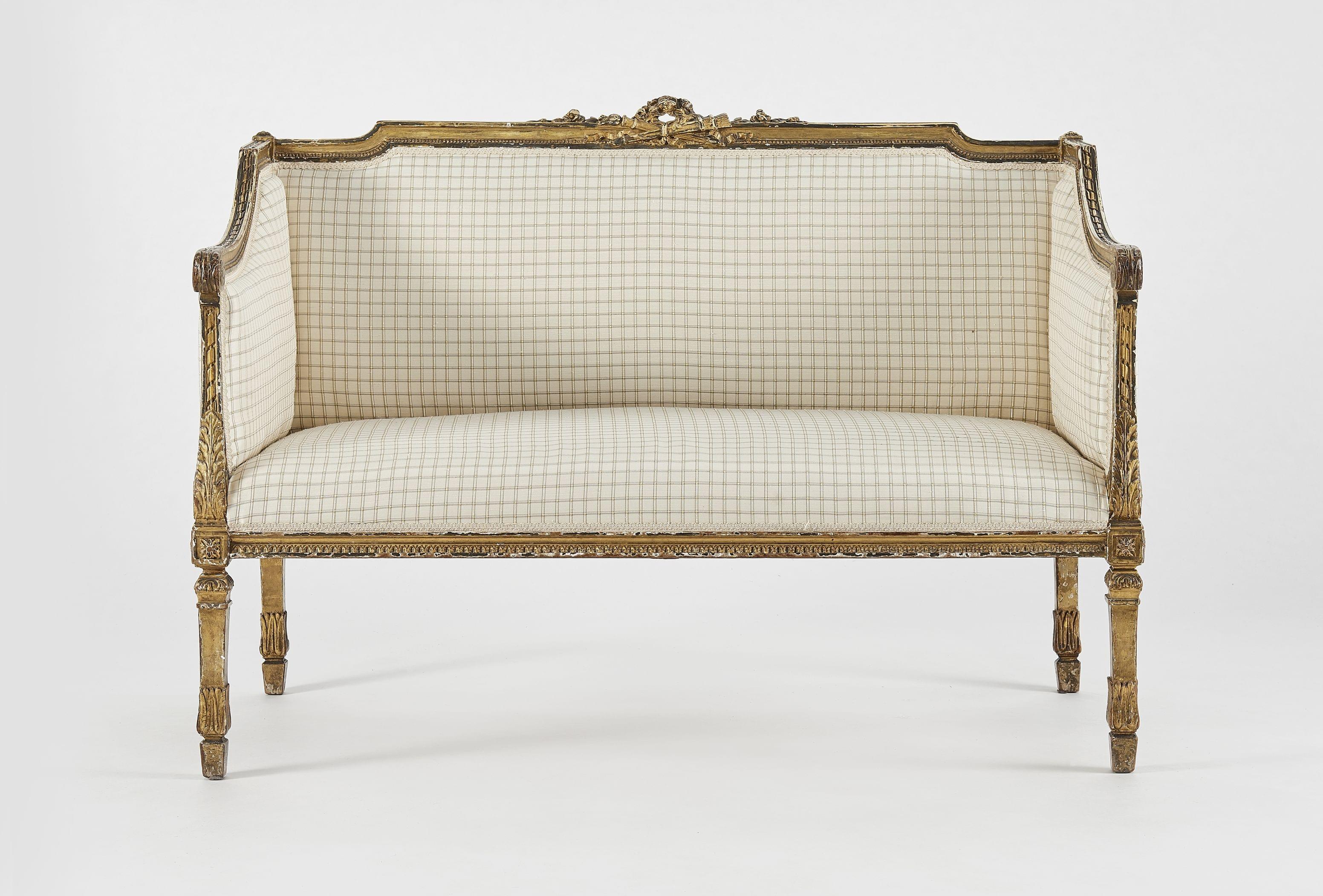 Bois sculpté et doré, soierie à carreaux, L 120 cm. Provenance: collection Pernet-Villaverde