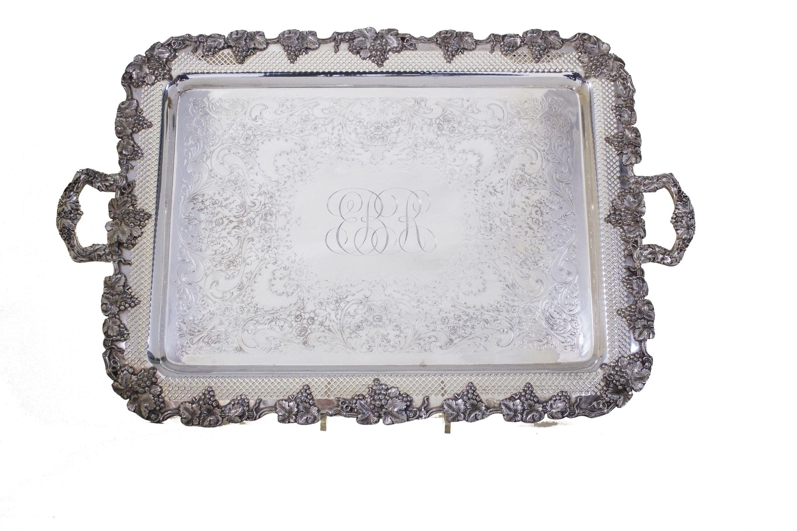 1137. Barbour SP Internationa Co, plateau de service à bordure ajourée de treillis et ornée de grappes de raisin