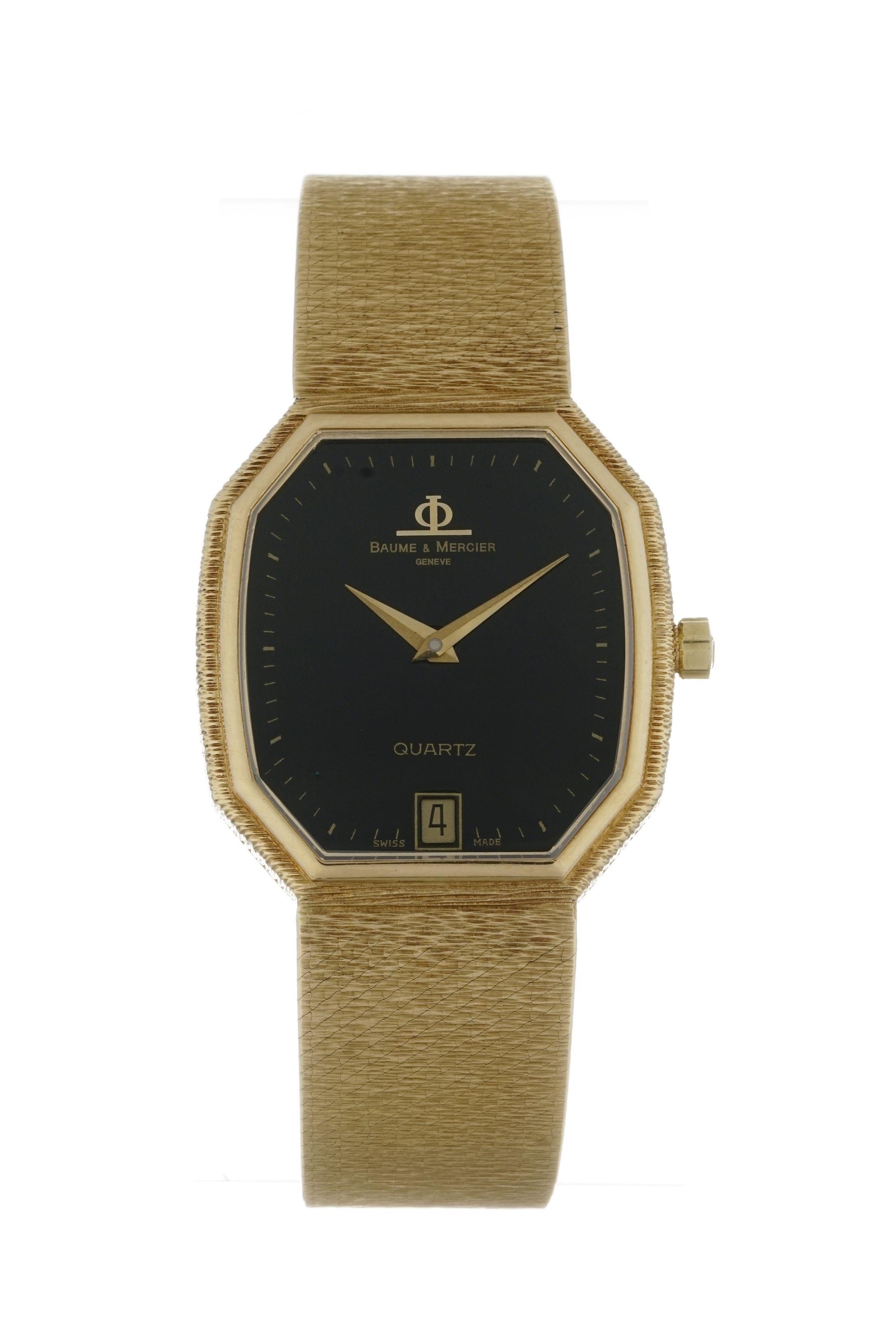 Cadran doré, aiguilles et chiffres arabes noirs, secondes à 6h,...