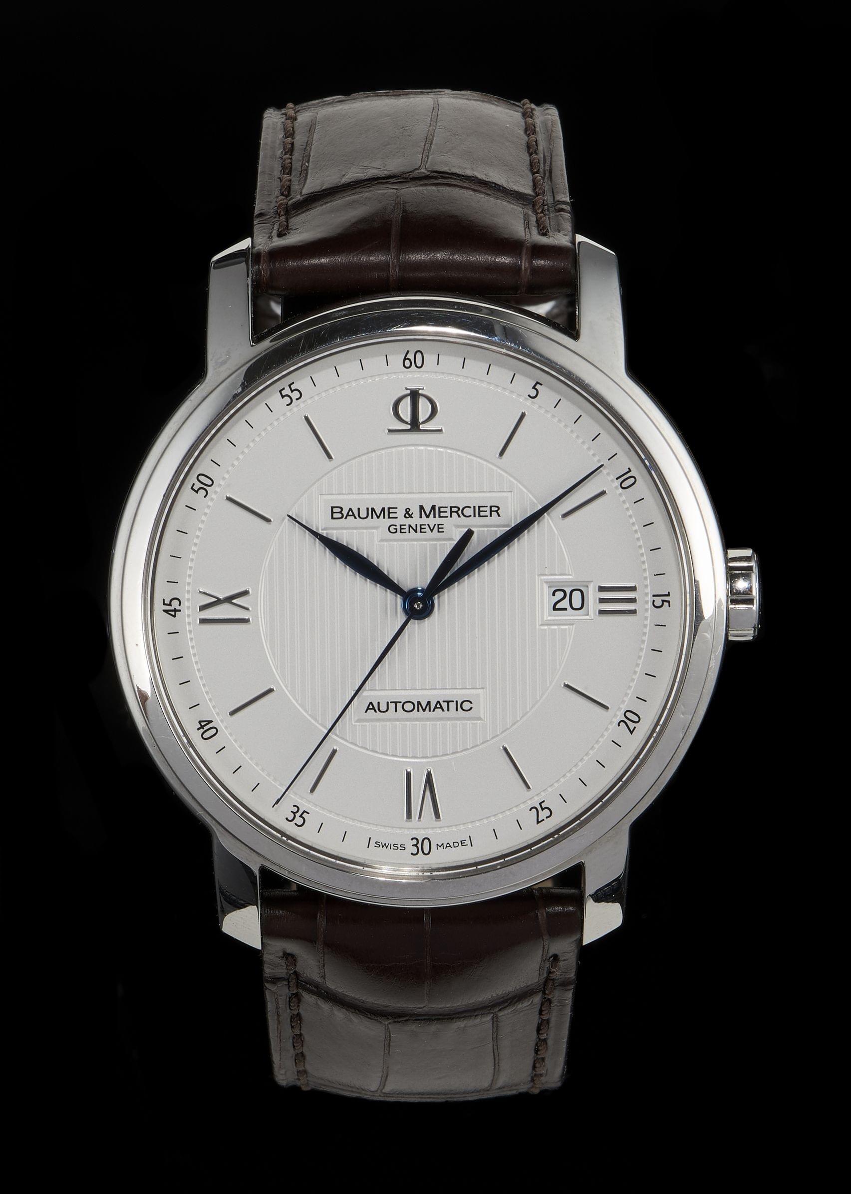 Cadran gris, aiguilles bleues, chiffres romains et index bâtons argentés, date à guichet à 3h, acier, D 42 mm