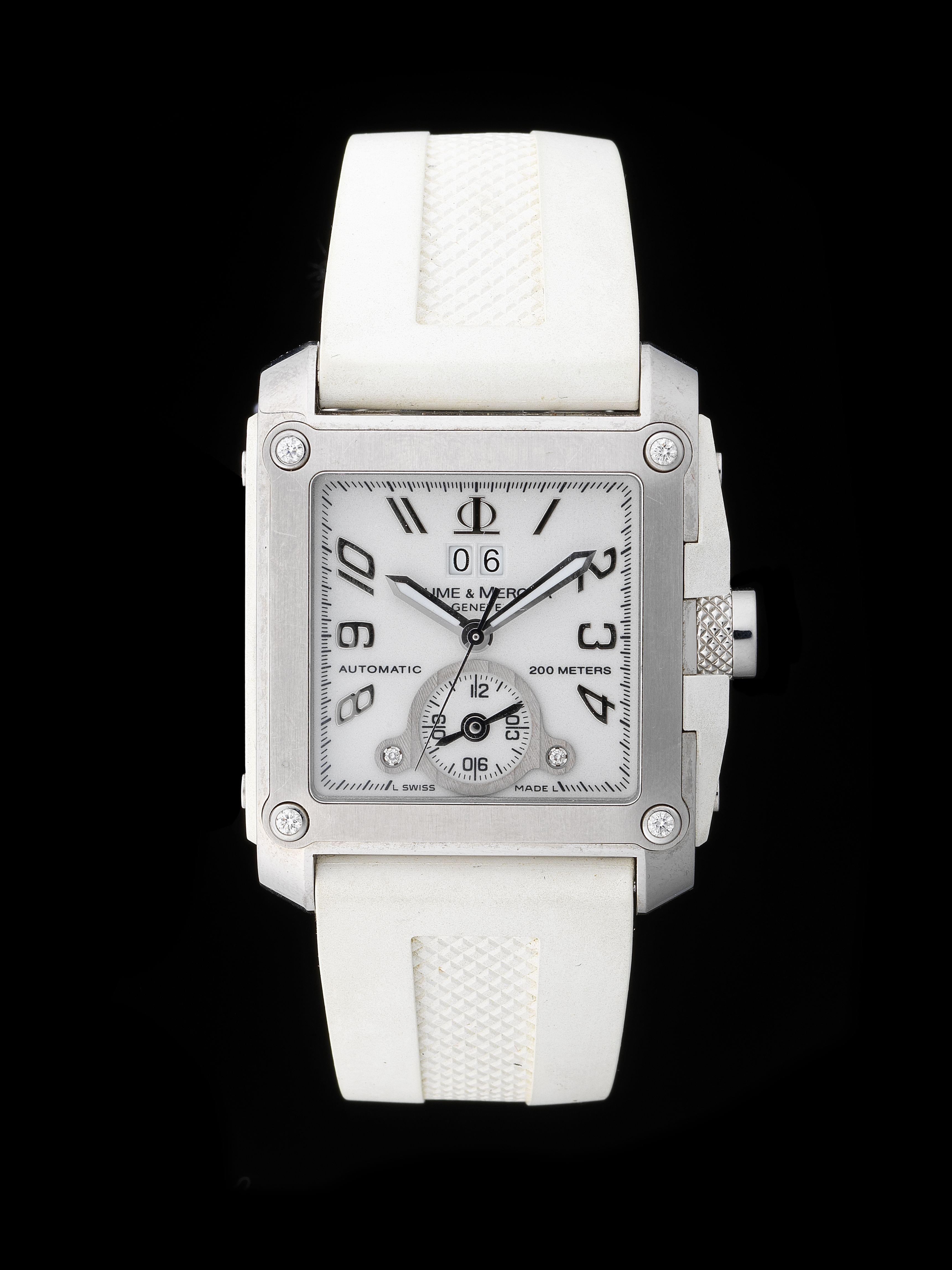 7. Baume & Mercier, montre carrée automatique sertie de 4 diamants