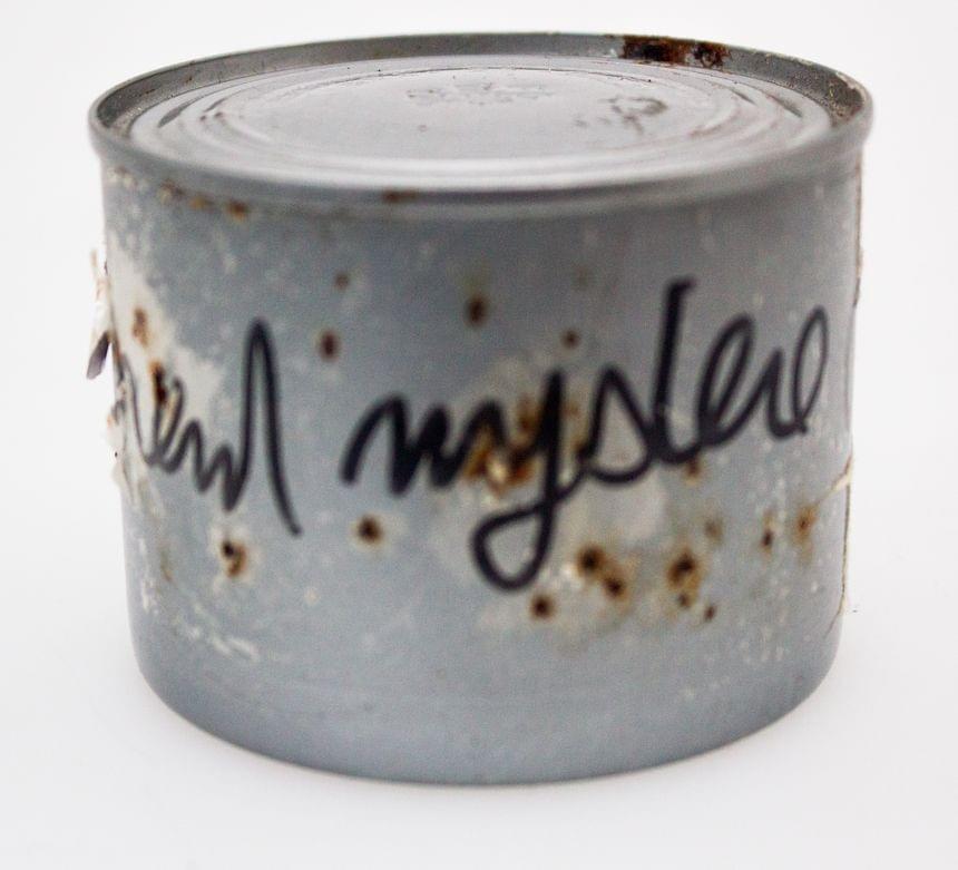 Aliment mystère, boîte de conserve, feutre noir, titré et signé, D 7,5 cm