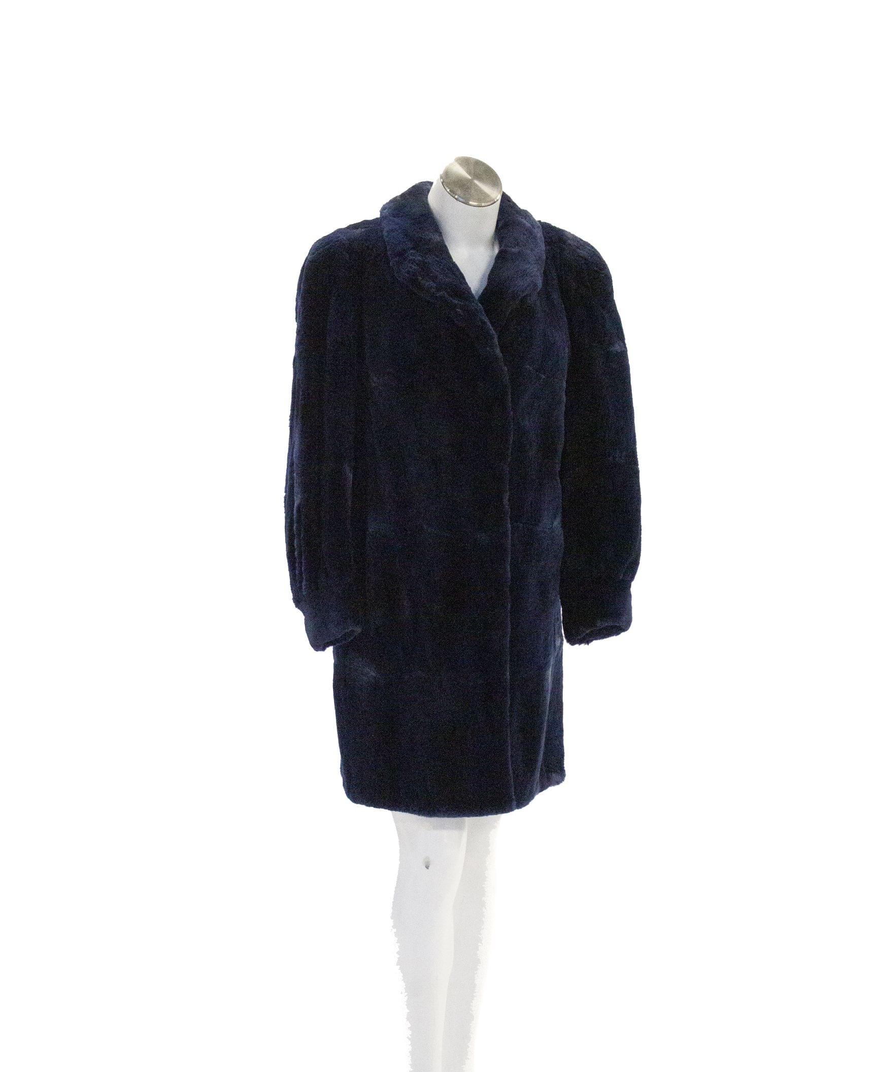 Fourrure probablement castor teinté bleu, intérieur en soie imprimée, poches latérales, fermeture à clips