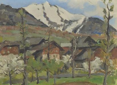 Village au pied d'un mont enneigé, huile sur carton, signée, 27x...