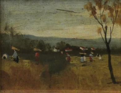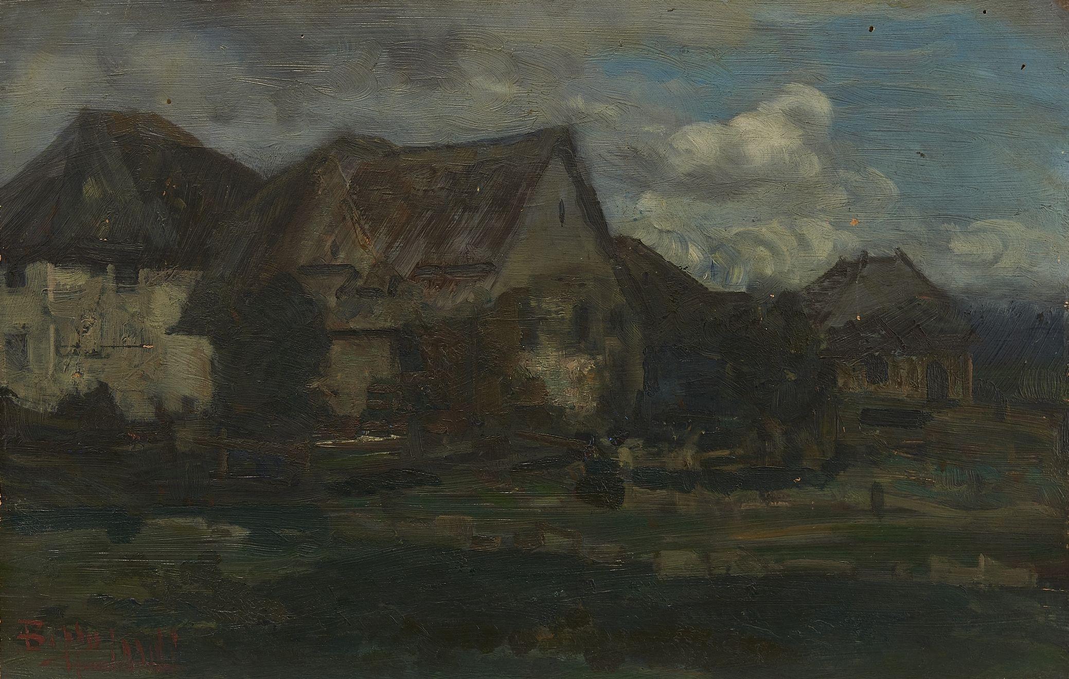 Les maisons de La Nove, huile sur panneau, signée, datée au dos 1902, 30x46 cm