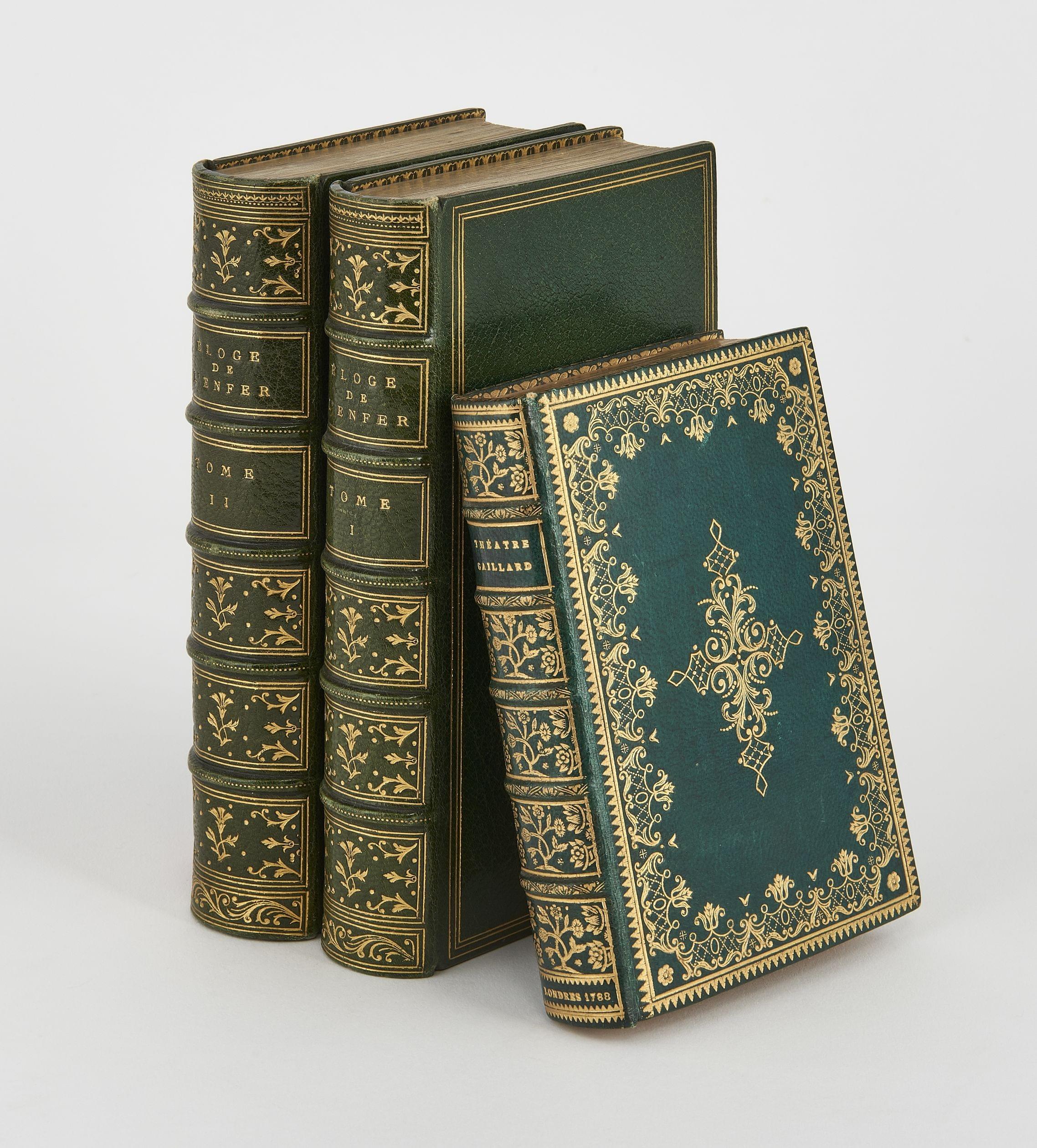 2 vol. in 12, maroquin vert, dos à nerfs ornés, triple filet doré sur les plats, dent. int., tr. dorées sur marbrure. Reliure d'AMAND.