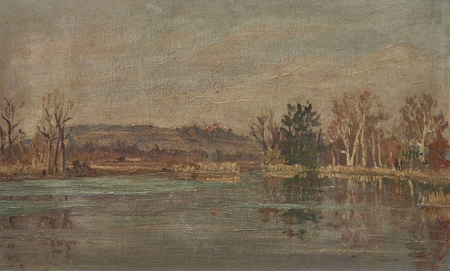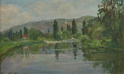 Deux paysages lacustres, paire d'huiles sur panneau, 16x27 cm