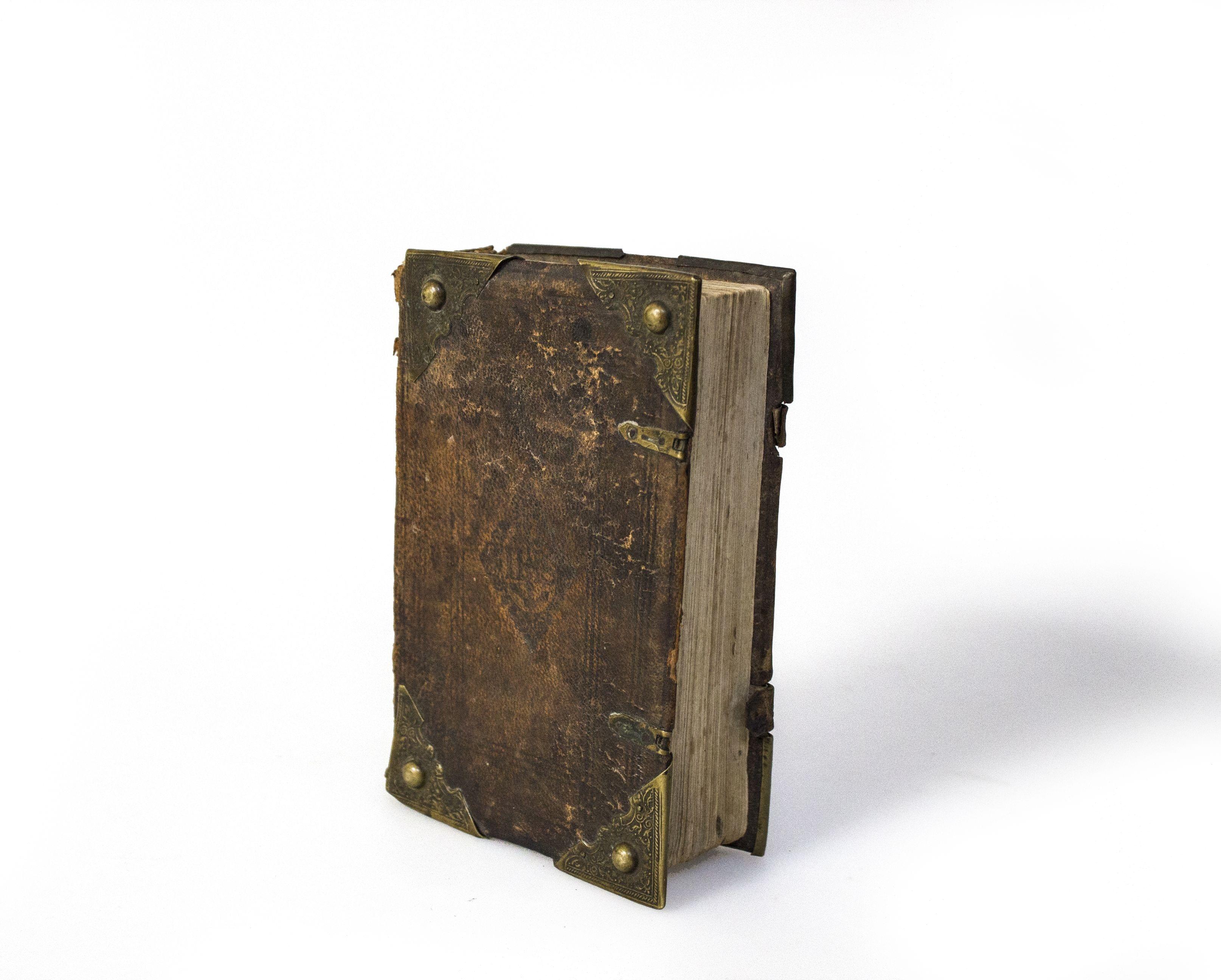 in-12, basane à décor estampé, écoinçons en laiton repoussé. Belle impression en caractères gothiques ; gravures sur bois. Monogramme de la Compagnie de Jésus. (Reliure accidentée)