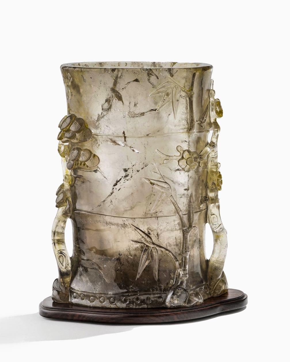 Cristal de roche fumé sculpté à décor des trois amis de l'hiver, H 24 cm