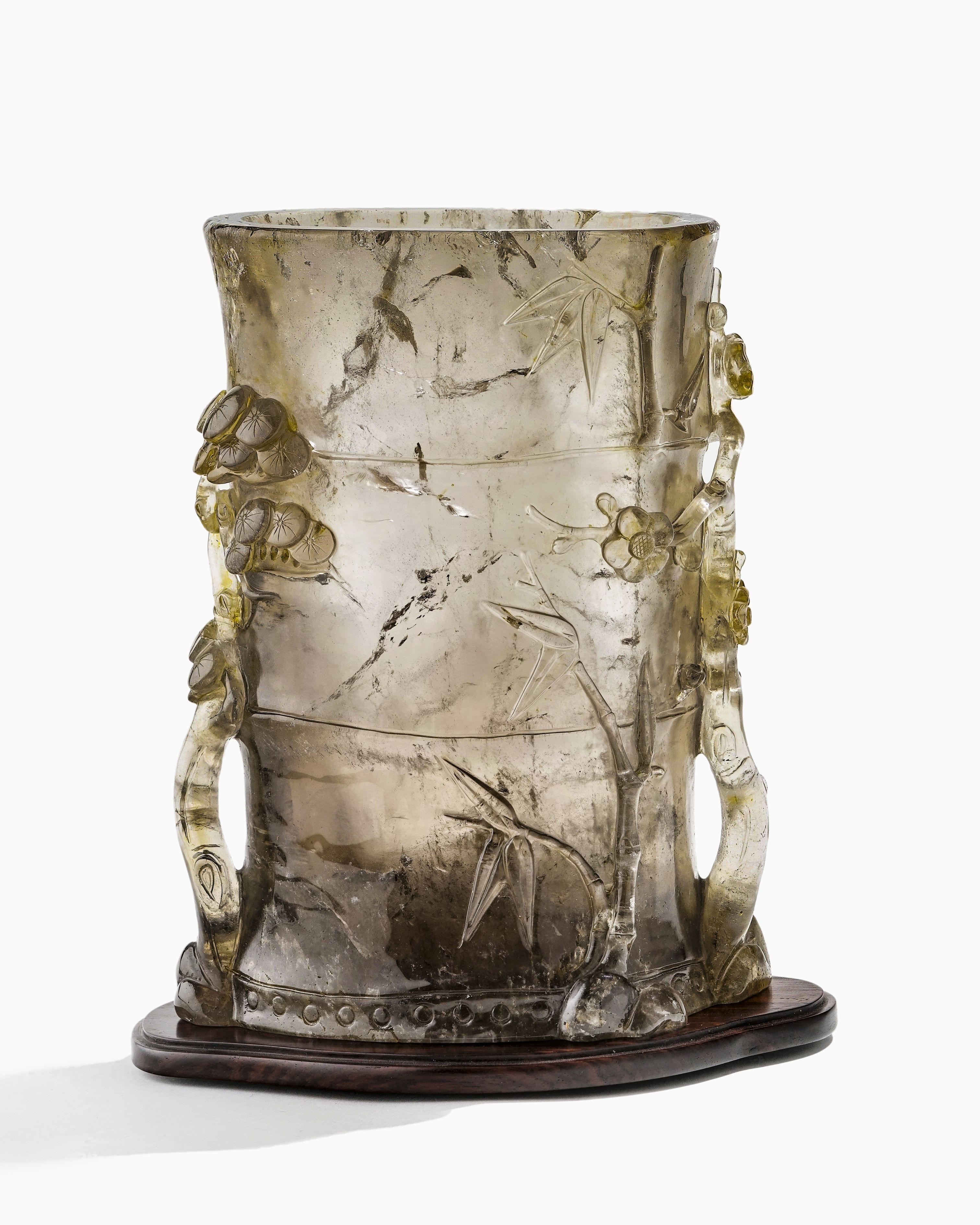 Cristal de roche fumé sculpté à décor des trois amis de l'hiver, H 24 cm