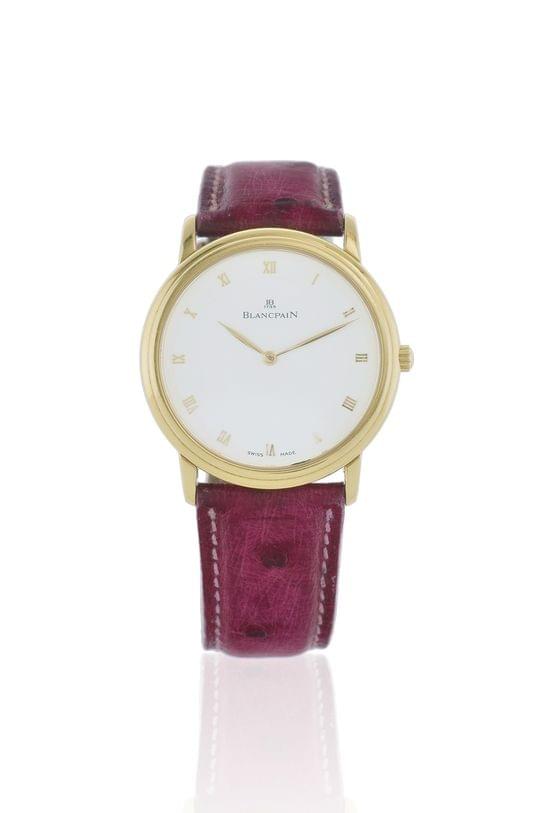 Cadran blanc, chiffres romains et aiguilles dorés, bracelet autruche, mécanisme visible, or 750, D 33 mm