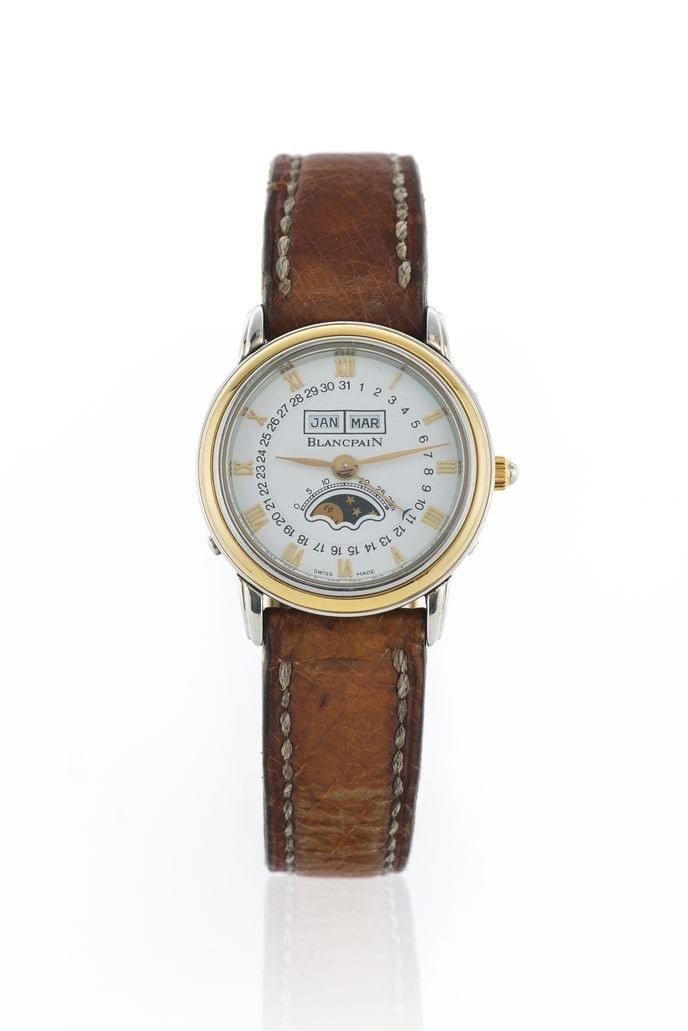Triple quantième, phase de lune, cadran blanc, chiffres romains et aiguilles dorés, or 750 et acier, D 25 mm