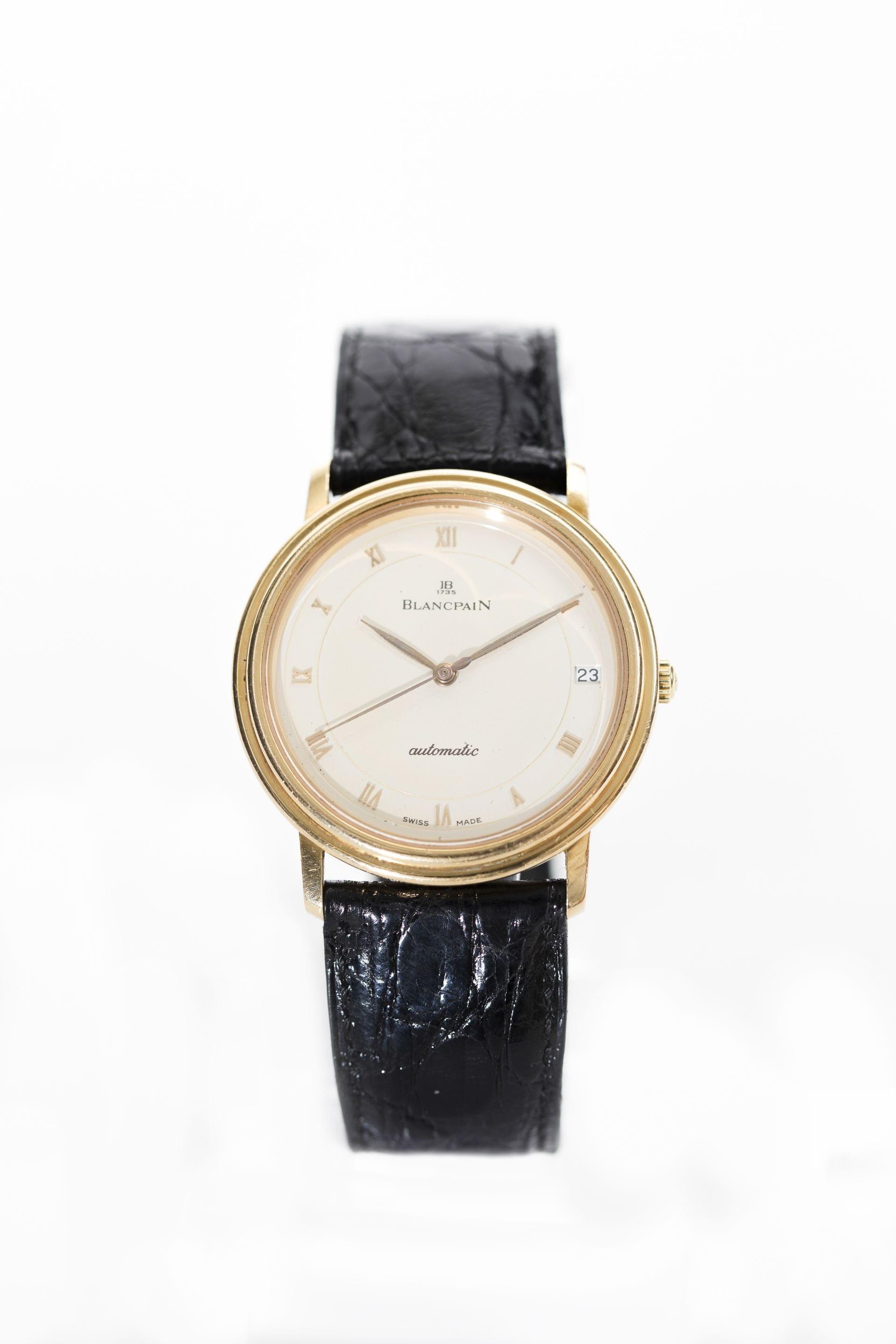 Cadran crème, chiffres romains et aiguilles dorés, date à guichet à 3h, années 90, or 750, D 34 mm, poids brut 45 g, dans un écrin