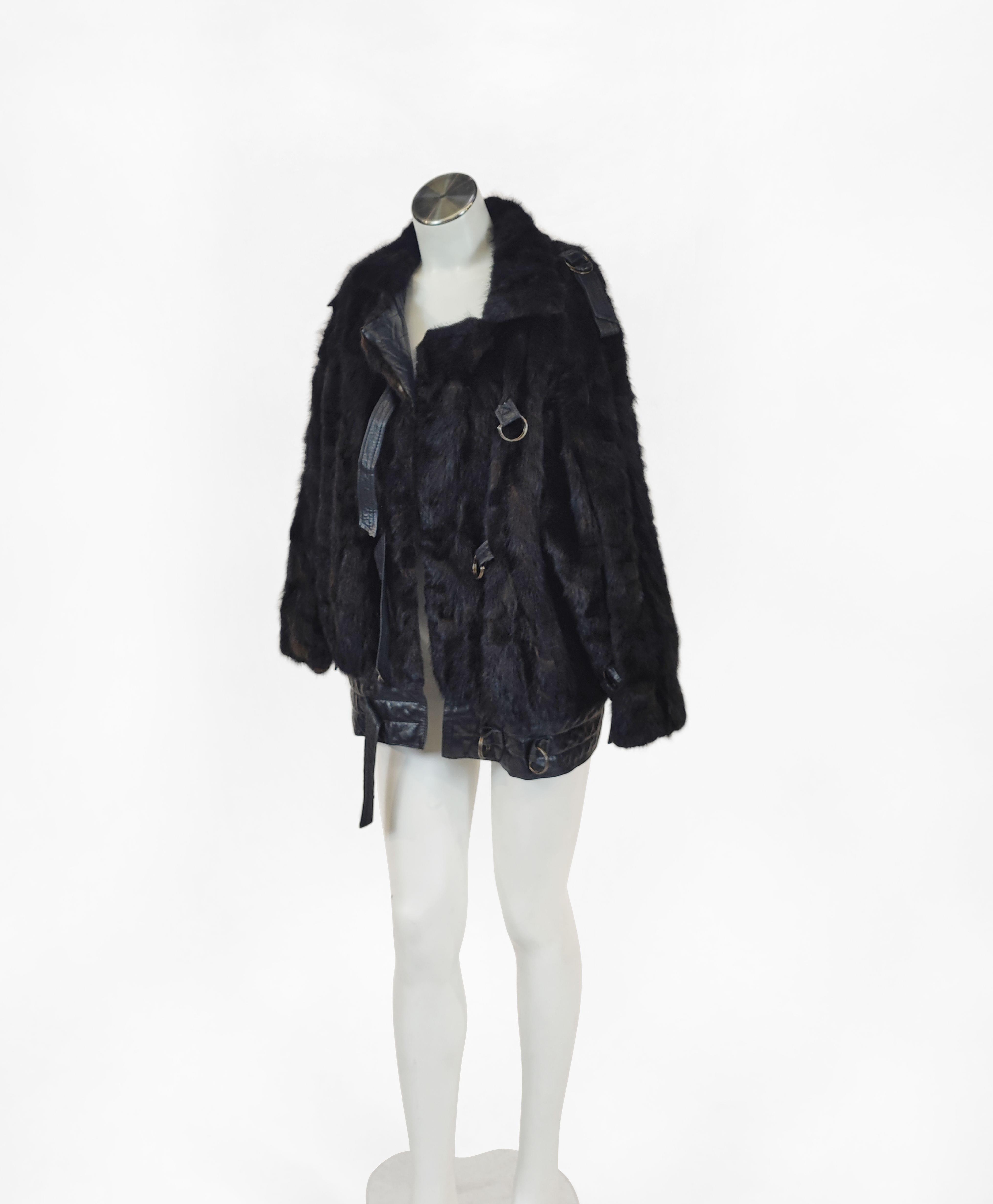 Fourrure de vison brun et cuir noir, parements de cuir, fermetures à lanières de cuir, poches latérales