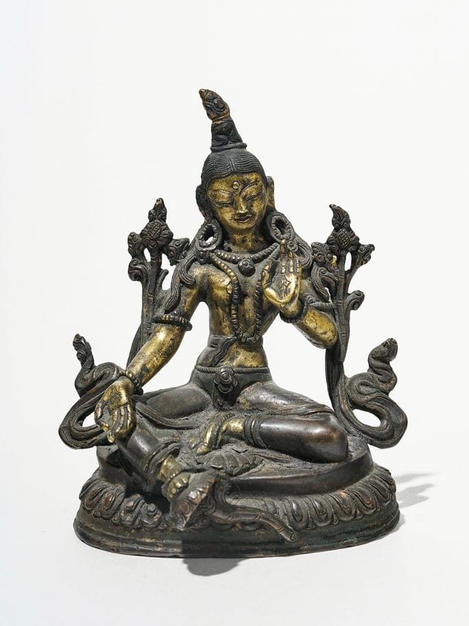 Figuré assis en lalitāsana, sur une base lotiforme, bronze partiellement doré, H 11 cm