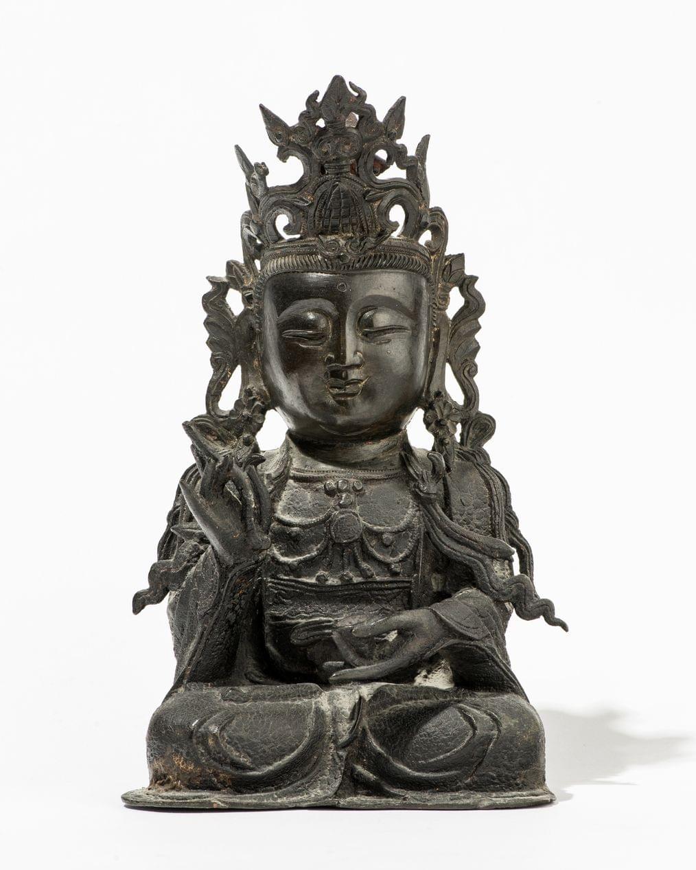 Bronze à patine brune, art sino-tibétain, fin XVIIIe s, dans le style Ming, H 26 cm