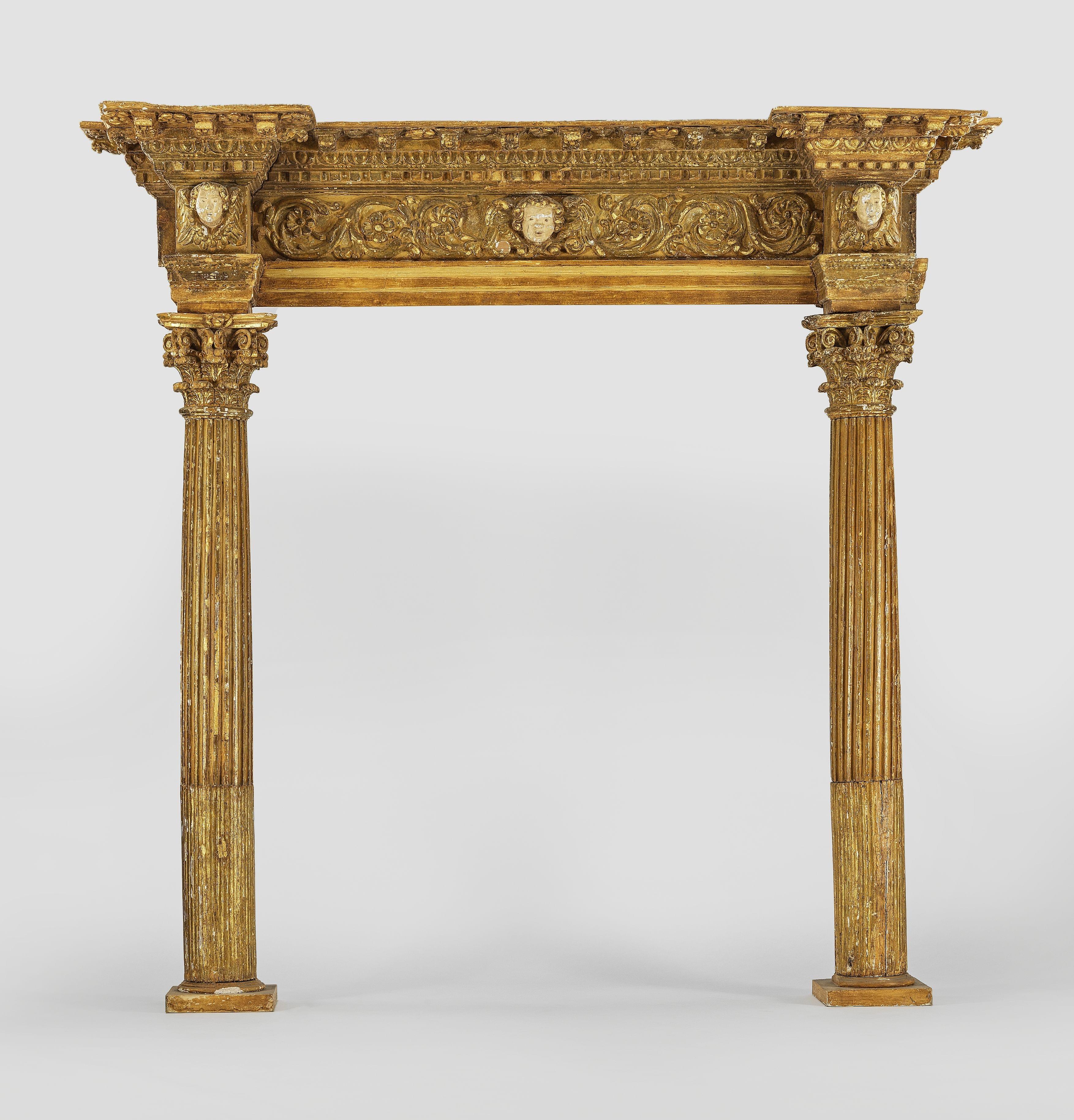 Bois sculpté de trophées de chasse avec cors et lièvres, 120x76...